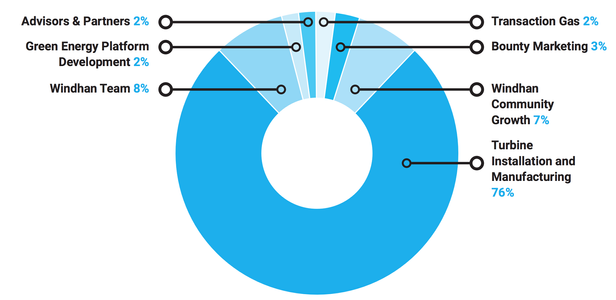 In total, 250 million coins will be issued for the development of the project. Of these, 190 million will be allocated for the installation of all wind turbines, the remaining part will be distributed among the founding team, and the other part will be allocated for the further development of the project. In total, 5 stages of sales will be allocated by means of which investors will be able to purchase each of the tokens at a special price. The minimum will be 0.65 EUR per 1 WHN, after which it will reach its maximum of 0.96 EUR per 1 WHN.