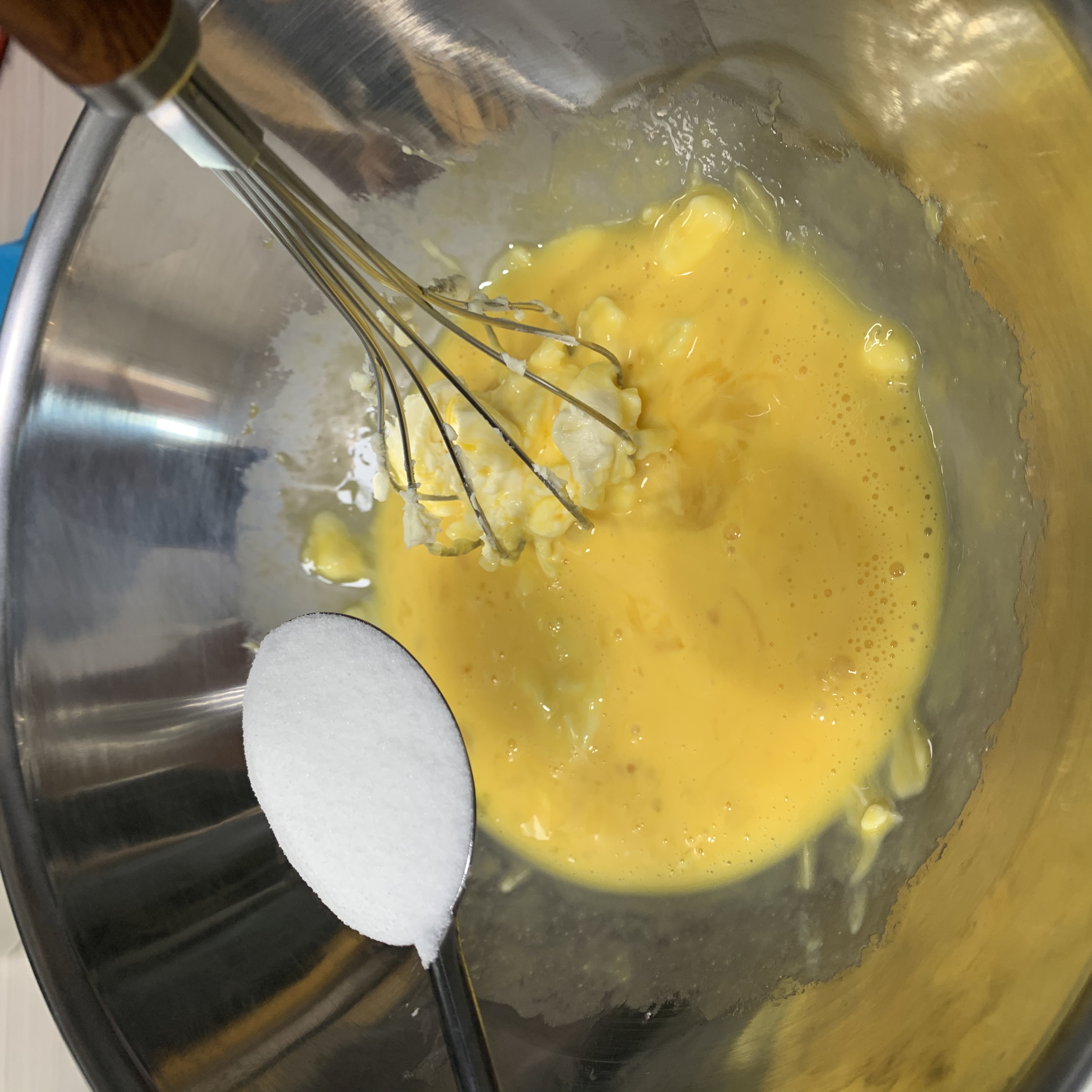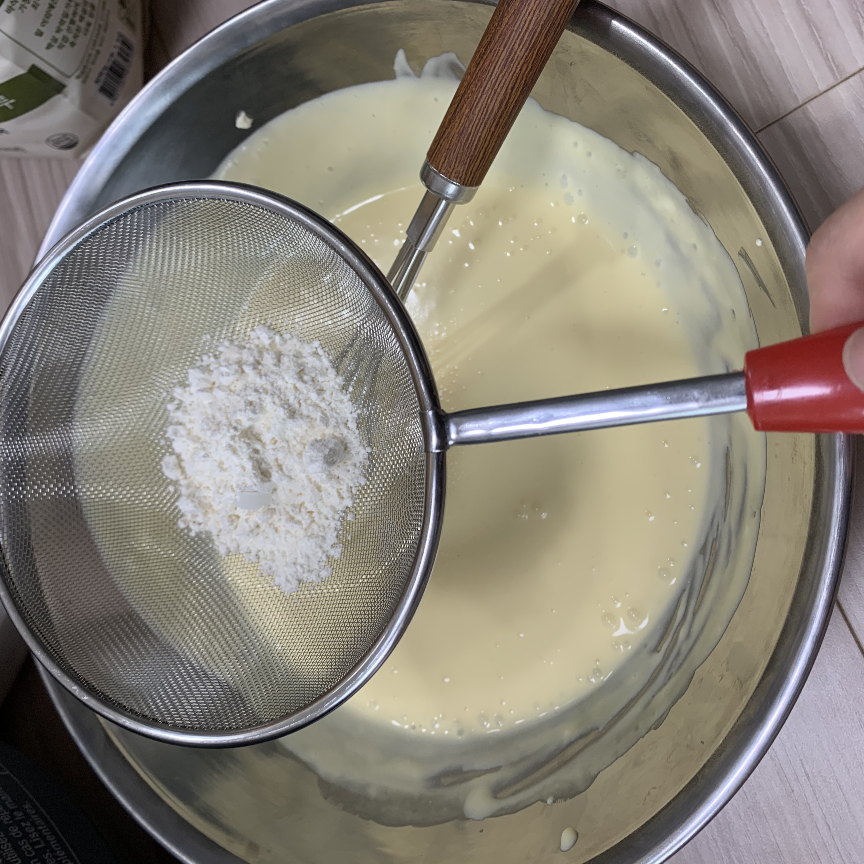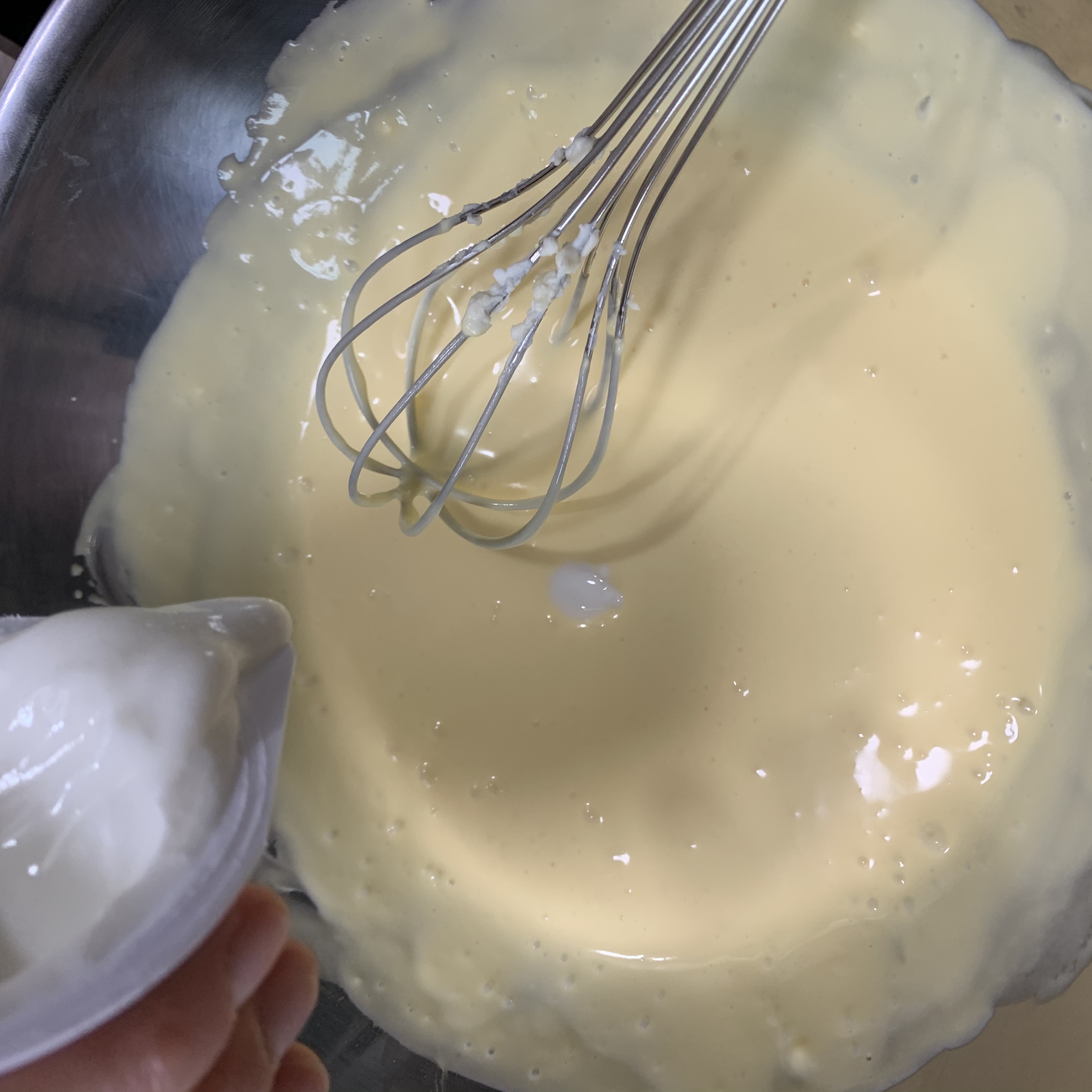 다섯. 반죽하시면서 중간에 설탕 2T, 요플레, 박력분 2T를 넣어주세요 ! 박력분은 체를 이용하여 탈탈 털어서 넣어 주시구, 요플레를 넣지 않으면 케이크에서 단맛이 살지 않는다는 점 알아두세요 !!