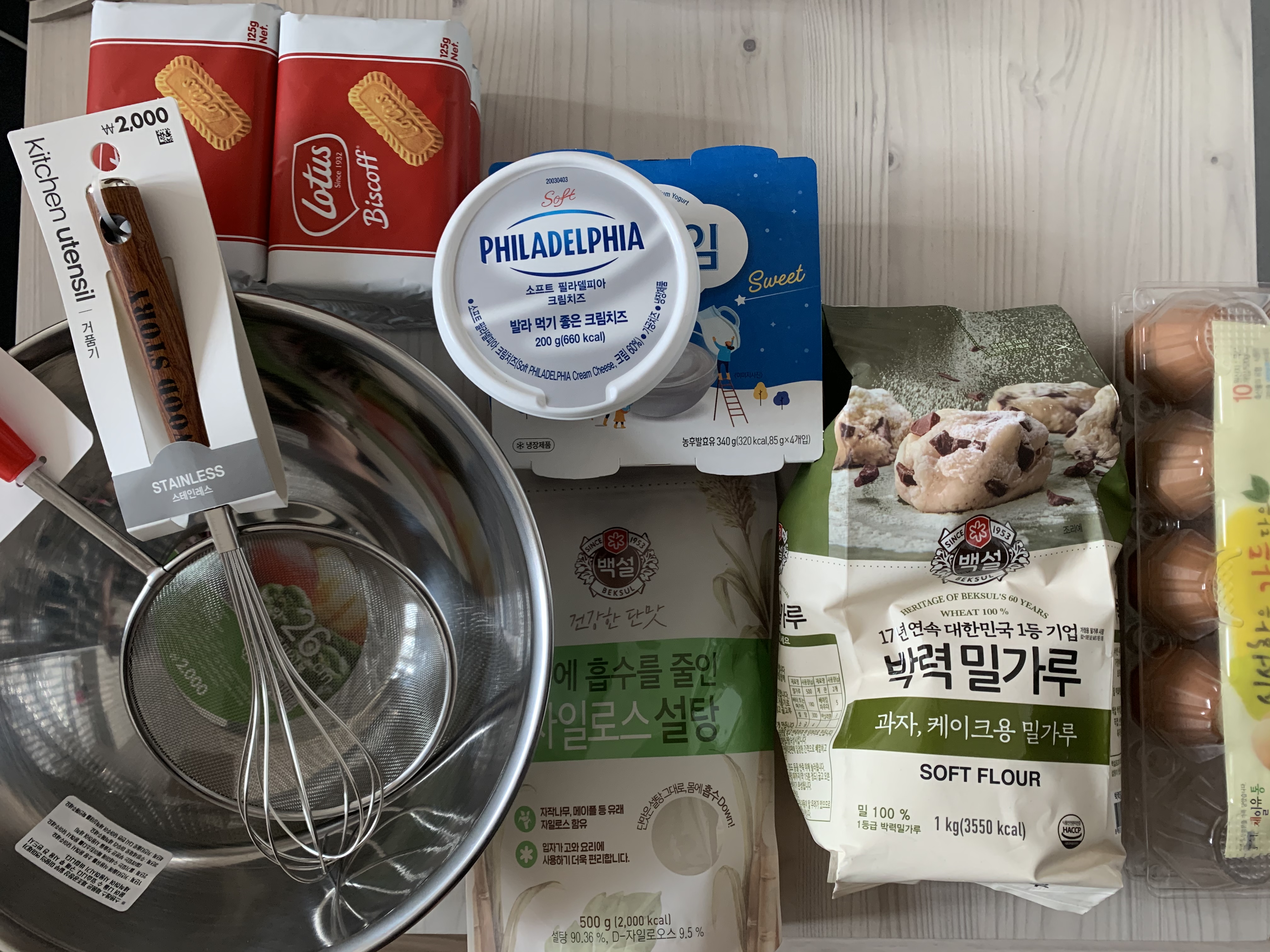 로투스 과자 2-3팩, 필라델피아 크림치즈, 요플레(완젼 베이직한거), 박력분, 설탕, 계란, 그릇, 체, 거품기