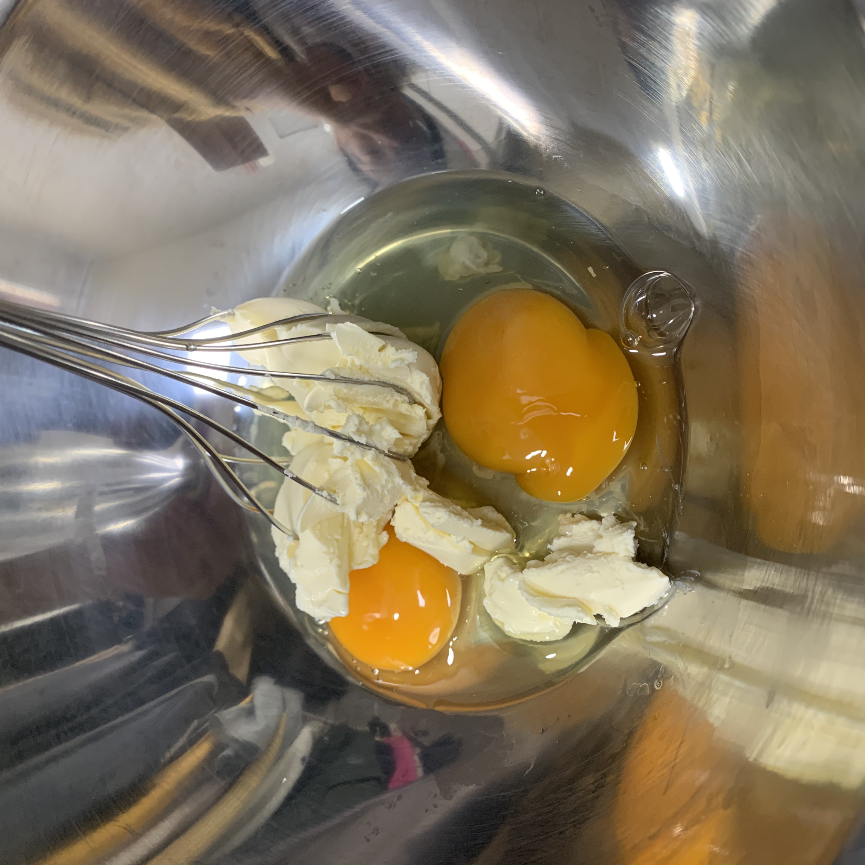 넷. 여기부터 팔이 조금 아프실 걸 각오해야합니다 ;( 계란을 두 개 까주고 필라델피아 치즈를 조금씩 넣어가며 반죽으로 만들어주세요! (크림치즈는 1/3씩 넣어서 섞어주는 것이 편합니다! 한 번에 다 넣으면 뻑뻑해서 힘들어요ㅠㅠ)