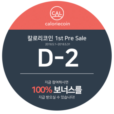 현재 진행중인 칼로리코인 1차 프리세일(2018. 5. 1 ~ 2018. 5. 31) 중 칼로리코인 구매 시 100% 보너스를 지급합니다.