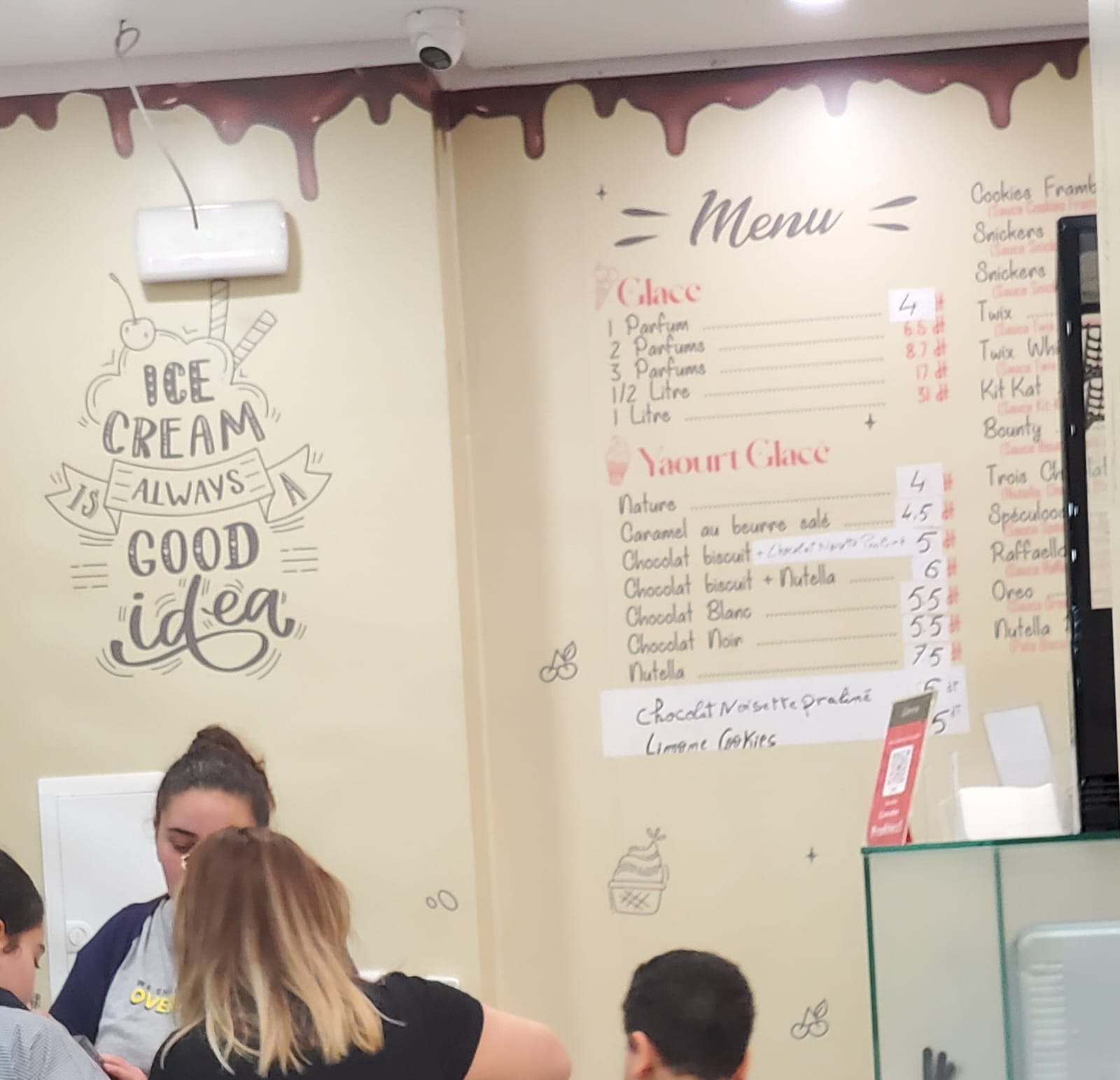 The decoration of the shop also matched the concept very well, because the walls included sweet-themed drawings and phrases related to ice cream, as well as the menu board, which helped create a warm visual identity and made the place feel more welcoming and enjoyable for customers spending a few minutes inside.