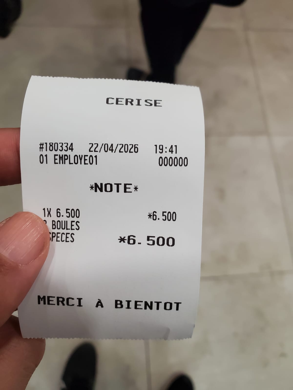 The receipt confirms that I paid 6.500 TND for two scoops of ice cream, which I found reasonable for the overall experience and product quality.