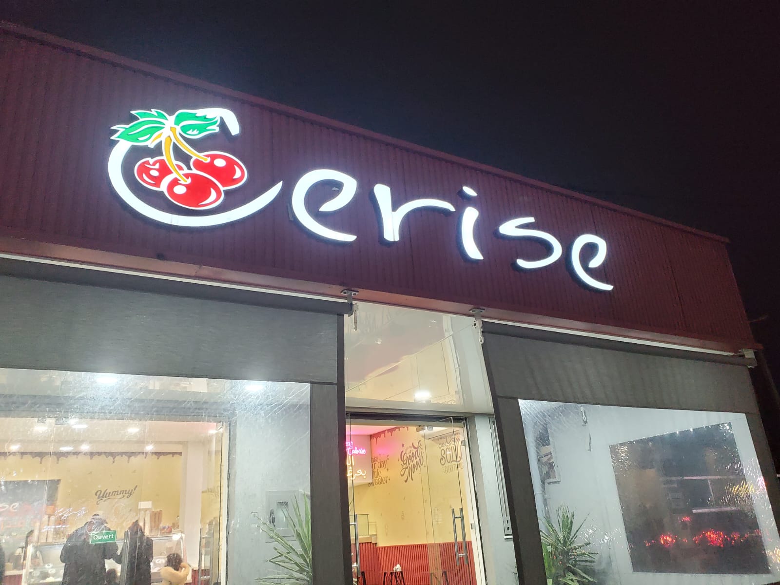 The bright exterior sign of Cerise gives the shop a charming identity and makes it easy to recognize from outside, especially during the evening.