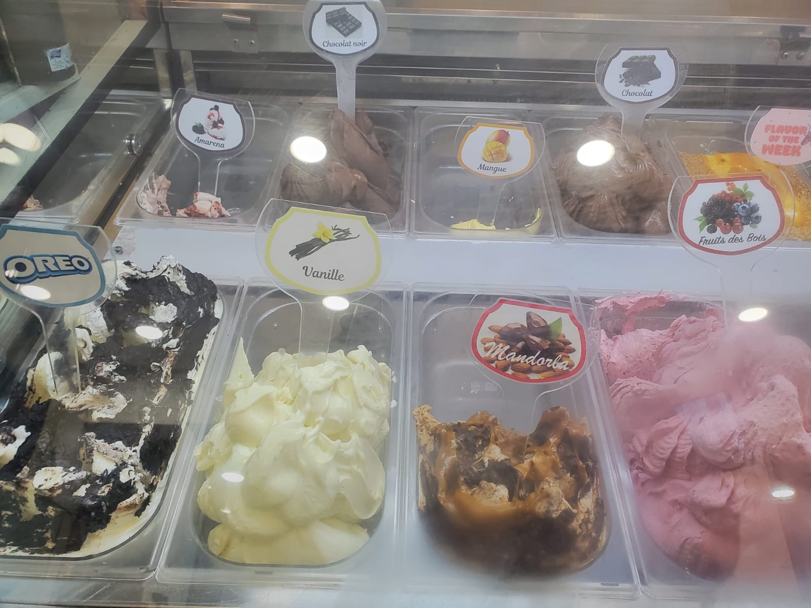 To answer the first question clearly, I can say that I had a good opinion of this ice cream shop, because the place looked clean, the presentation was pleasant, and the available flavors were diverse enough to satisfy different tastes, whether someone prefers fruity, creamy, or chocolate-based options, and during my visit I was able to notice flavors such as vanilla, chocolate, dark chocolate, mango, amarena, fruits des bois, mandorla, and Oreo, which shows that customers do have enough choices to find something that suits their preference.