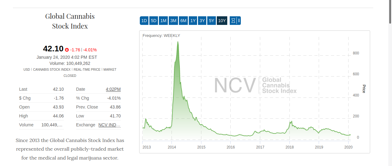 In 2014 there was large investments into the cutting edge of the market. As of now re consolidation along with better products and technologies will rise to the top. The cannabis stock index is at an all time low. Signalling a time to get out or buy. Having some insider information; I am here to be the oracle that says...Wait, there is a lot of Ponzi-Pyriamids in the cannabis space now be careful. As the concept of global cannabis sounds appealing and investing in cannabis was a good idea in 2009, now its time to find the next wave to catch and ride. The cannabis industry is plagued by fraud and corruption. Growers have been known to alter the truth about what products they put on the crop in addition to the source of the genetics and potency. An interesting idea is smart chains that ensure product quality and implement ISO 9000 as a management system by default. Ironically the dead coin THC is now proposing such. Lets see where this goes. This is NOT an endorsement for THC coin. But do keep your ear to the ground on this issue as regulators look for avenues to open the markets and control the fraud. The smart investor shall have a complete immutable record of product from seed to final delivery. This shall be available to all via a web console that can be accessed by those that need to know. Once we see No more bait and switch, not more fraud and corruption in the cannabis industry, then we shall see that stock index take a swing up up and away....But for now as an insider I am seeing naive investors putting money into second and third world countries being billed two and three times for the same items and not producing any products.