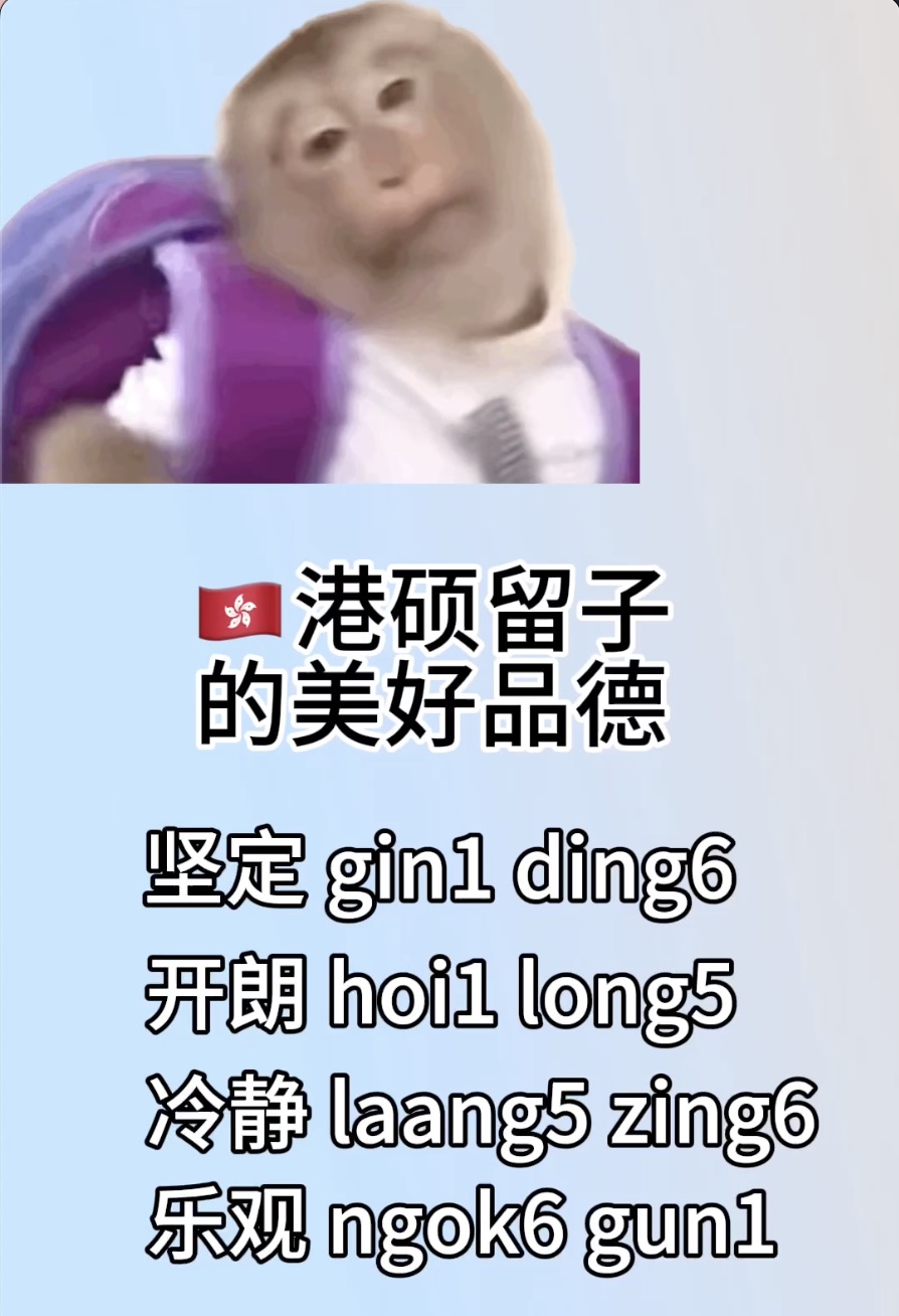 请查收港硕留子的美好品德(粤语版)malousaywhat (29)in #cantoneselearning • 3 years ago (edited)又在🇭🇰活了一天 我真棒! 本期粤语词汇教学总结👇 1⃣️ 坚定 gin1 ding6 2⃣️ 开朗 hoi1 long5 3⃣️ 冷静 laang5 zing6 4⃣️ 乐观 ngok6 gun1 #learning