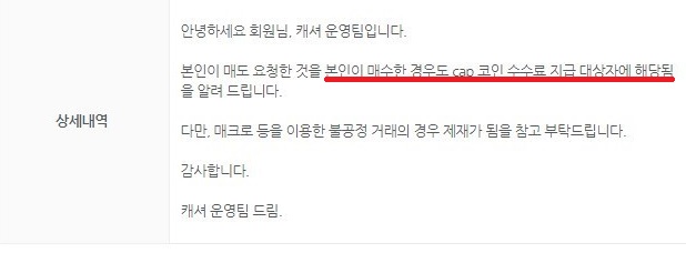 ※ CAP 의 정확한 지급을 위하여 기존 구매 시 코인으로 적용되던 거래 수수료가 8월 23일 00:00시 기준으로 원화 수수료로 변경됨을 알려드립니다.