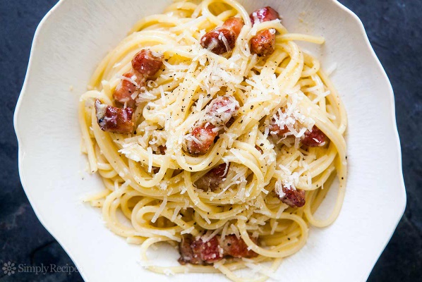 Spaghetti pasta alla carbonara. Luscious and wonderfully indulgent, pasta carbonara takes as long to make as it does to cook the pasta. The ingredients are simple—just spaghetti (or other long pasta), and the carbonara is made with pancetta or bacon, eggs, Parmesan, a little olive oil, salt and pepper. The silky carbonara sauce is created when the beaten eggs are tossed with the hot pasta and a little fat from the pancetta or bacon.