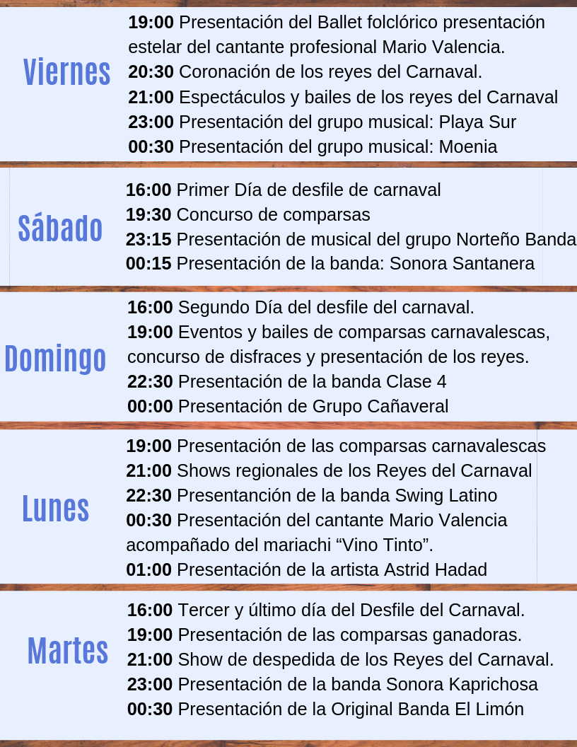 El carnaval se llevara a cabo del 1 al 5 de Marzo en la explanada del Palacio Municipal y en el Parque de las Palapas.