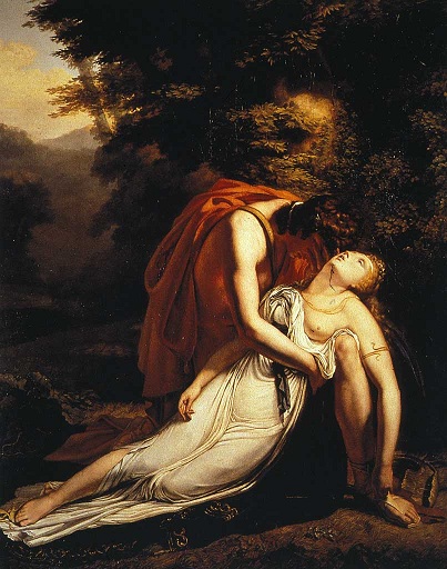 Solo había una cosa que Orfeo amaba más que la música y era su joven esposa, su idilio era como una perpetua primavera, eran tan felices que despertaban oscuros sentimientos de envidia entre los mortales cuya felicidad era efímera. Un día mientras Euridice recogía frutas en el bosque es observada por un Sátiro, una horrenda criatura mitad chivo, mitad hombre, conocido por sus incontrolables instintos sexuales, la bestia se abalanzó sobre la joven y ella trató de escapar pero el Sátiro la acorraló, ella dio un paso hacia atrás y cayó sobre un nido de serpientes venenosas.