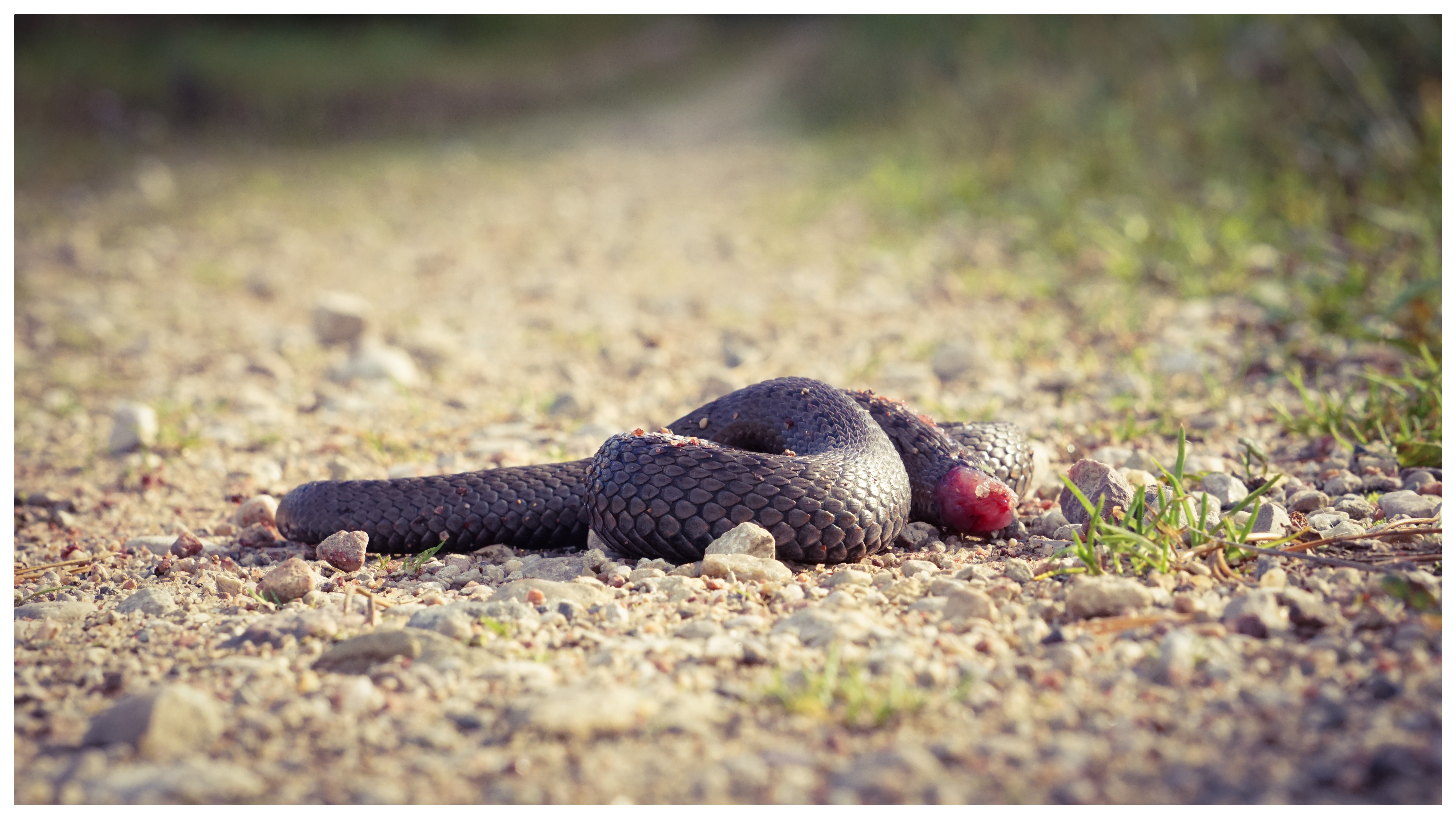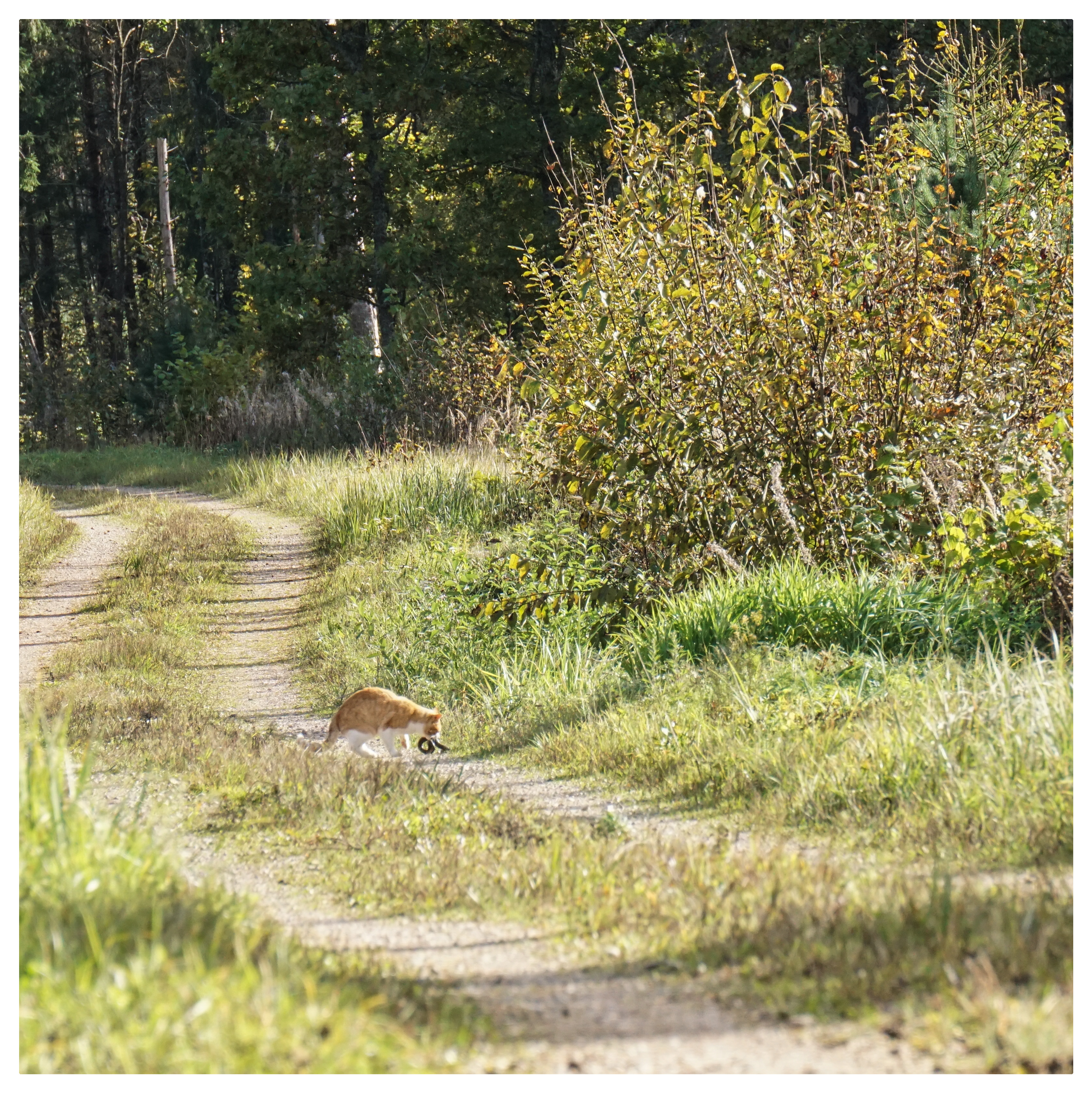 What will be a surprising situation if you are walking on a forest road and suddenly see how a Village cat is hunting a snake by the road. It was not afraid of this poisonous European viper, but dragged him out of the hay and ate his head. When I got closer, I also took a few close-up pictures. Of course Cat it ran away as soon as it saw me :))) , but when I went back further and far , it came back to the snake and continued to eat :)) ... And this snake was BIG one , what maid my eyes very big :)))