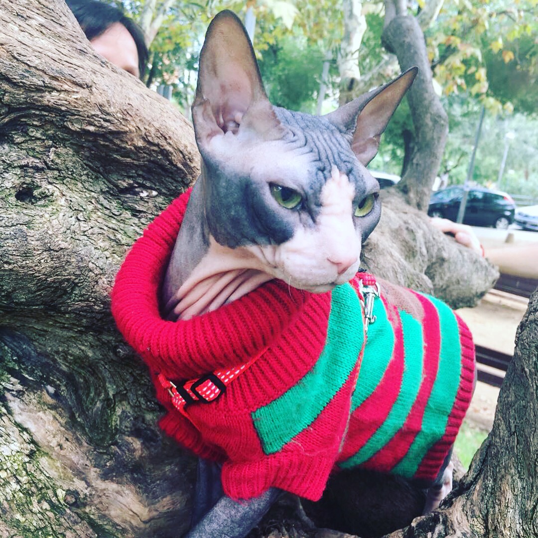This is my cat named Batman. It's a Sphynx cat, he is 2 years old and he love going out from the house he love a lot the people and he is unscared because he has no fear of cars, big dogs or noise of the autos.