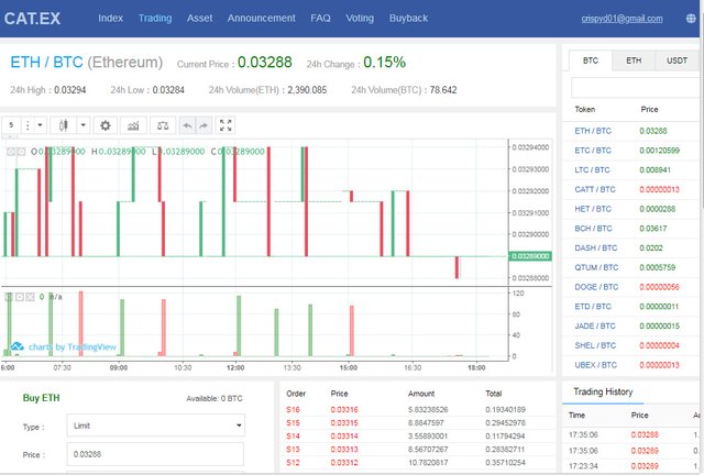 - Trading pairs: Users have a variety of different types of cryptocurrencies with exotic pairs to choose from; they have catt, bitcoin, ethereum, neo, stellar, ripple, tron, iost, litecoin, dash and others too numerous to mention.
