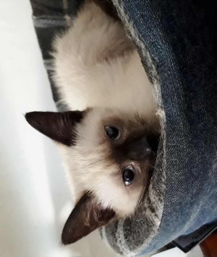 It's been six weeks since this little chap came into my workplace and I took him home although he was a thoroughly terrified and traumatised little ball of fluff, so wild that we thought he was feral and one person considered that he would be impossible to socialize. Lucky me, he has wormed his way completely into my heart and is not wild at all