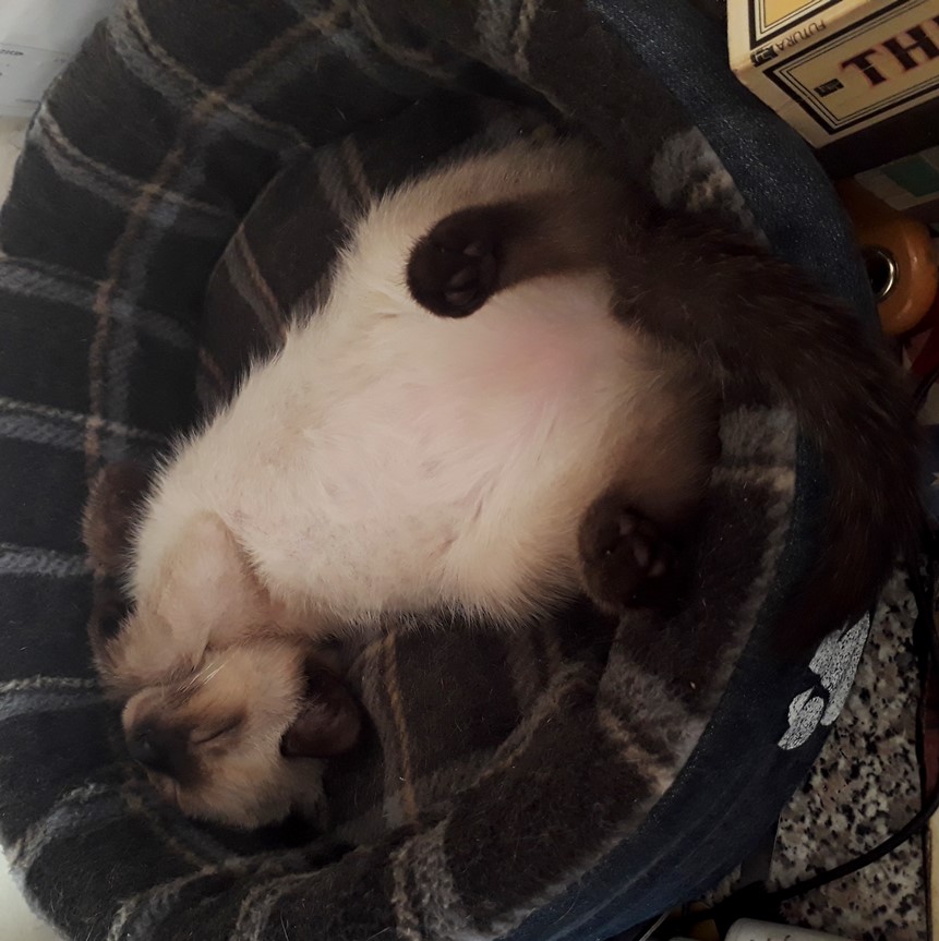 Completely Adorable. Still seems kind of small for being over six weeks. I know all about sleeping habits. Our cats prefer a plain cardboard box over the beds we have throughout the house.
