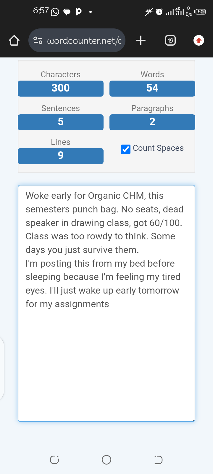 Woke early for Organic CHM, this semesters punch bag. No seats, dead speaker in drawing class, got 60/100. Class was too rowdy to think. Some days you just survive them.