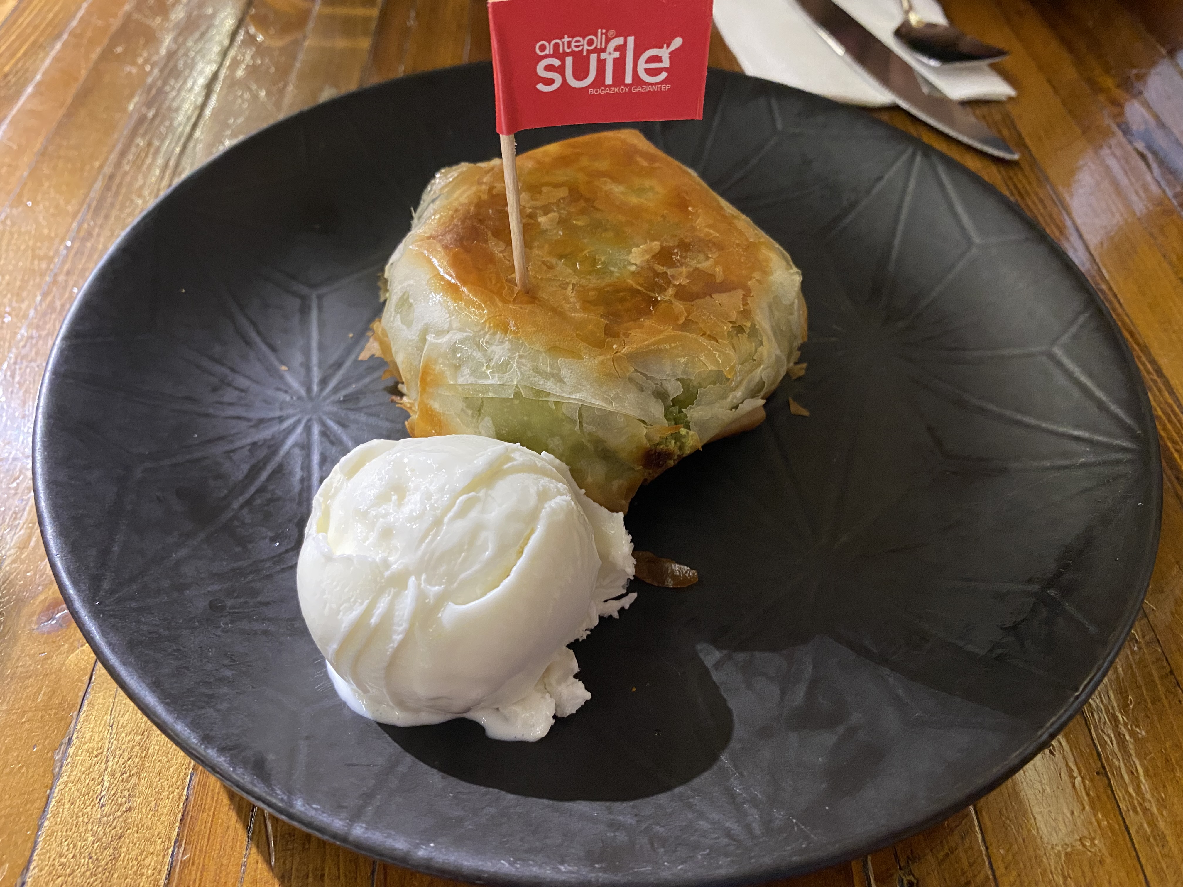 We chose this place because the soufflé here was highly praised. Its name is Boğazköy restaurant. The place was in the back street opposite the university. The place was very stylish and the food was delicious. I chose a menu with salmon as the main course. My wife chose a menu with meat, spinach and potato gratin. It was very delicious, I recommend it. I loved the presentation of the hummus. They made the chips themselves from phyllo dough, decorated the edge of the plate with these chips and brought the hummus to our table. I think it was very successful. Soufflé as dessert after the meal. We requested it. Soufflé was served with ice cream.