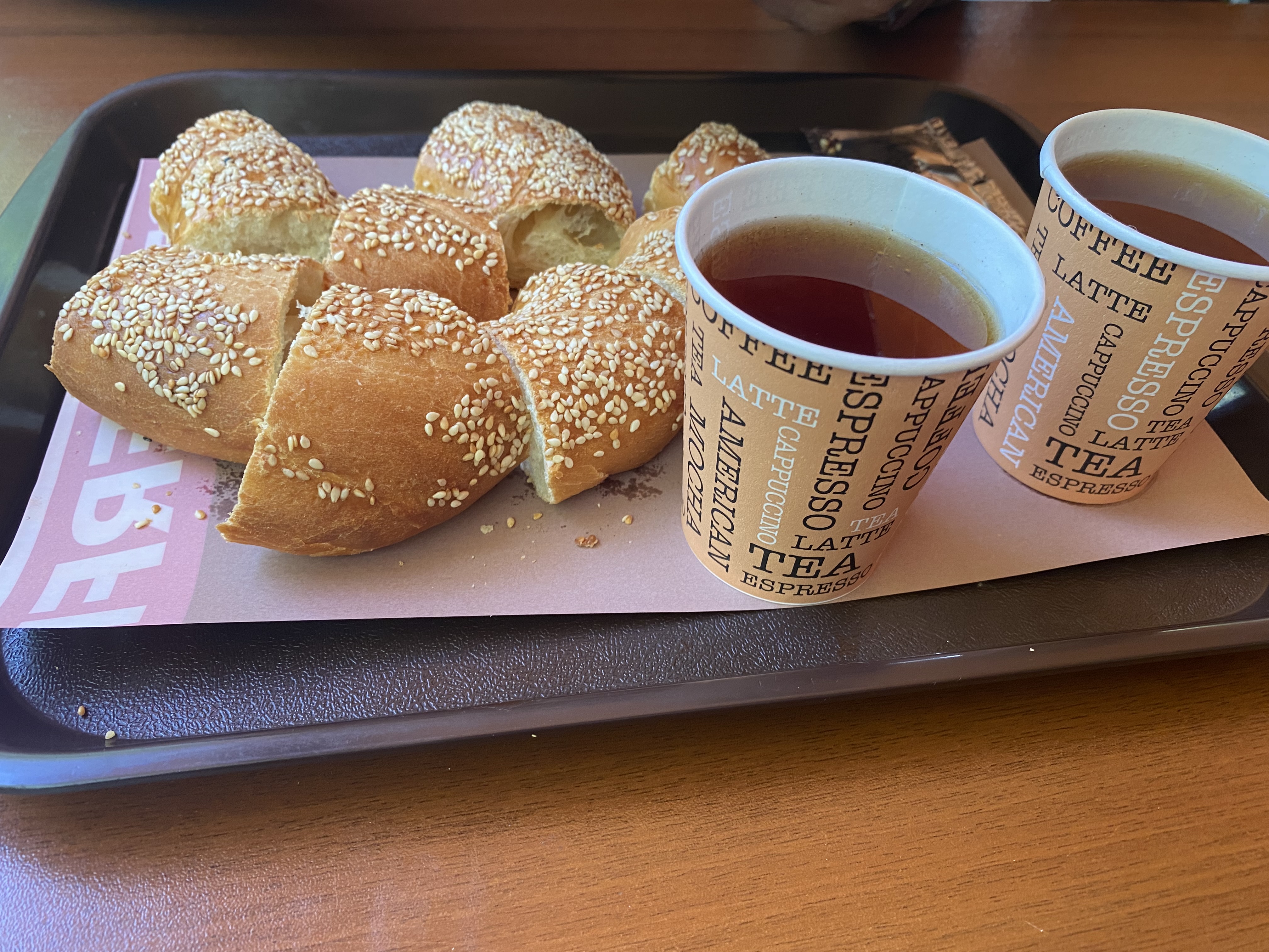 We visited the university in the first place. There were many cafes within the university. We chose one of the cafes, ate bagels and drank tea here. Since we set out very early, we decided to have some snacks.