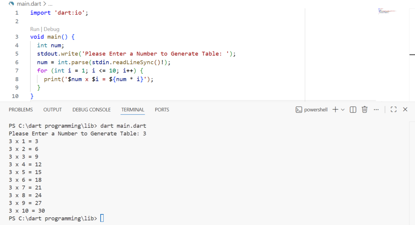 We can use dart programming language to write the tables and for many other purposes. I will teach you how you can write table of any number given by the user just by using for loop and some basic arithmetic operations.