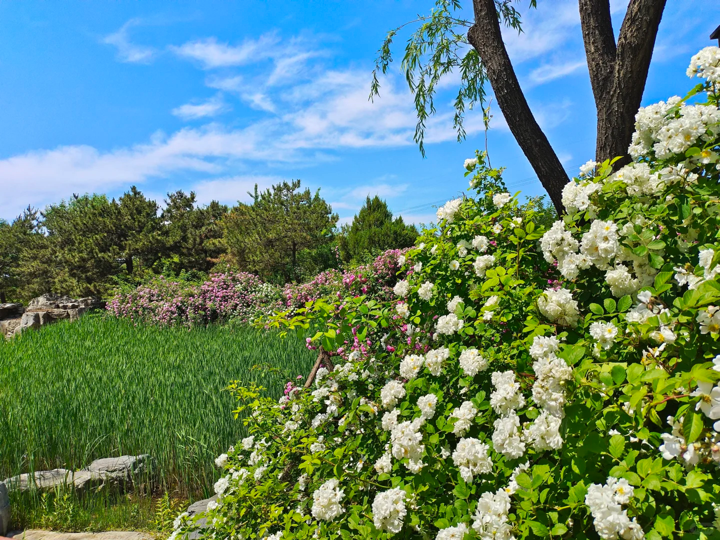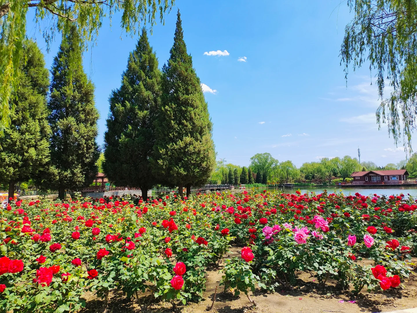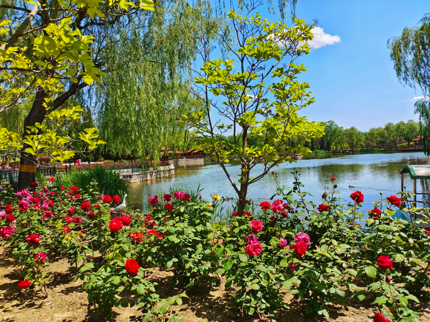 The park takes its name from the Ten Directions Buddha Pagoda. In summer, it transforms into a vivid tapestry of blooms. Entering through the west gate, the roadside is already lined with vibrant roses in full blossom. At first glance, the park may seem ordinary, but once you reach the lakeside, the scene bursts into life — a riot of hues and blossoms. I’m no expert in flowers, but I’m fairly sure I spotted roses, viburnums, irises, lotuses, and more.