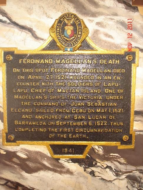 On this spot Ferdinand Magellan died on April 27, 1521 wounded in an encounter with the soldiers of Lapu Lapu, Chief of Mactan Islands. One of Magellan's ships, The Victoria, under the command of Juan Sebastian Elcano, sailed from Cebu on May 1, 1521 and anchored at San Lucar de Barrameda on September 6, 1522 thus completing the first circumnavigation of the earth.