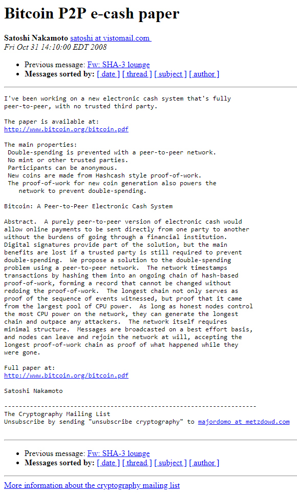 Sathosi Nakamoto integró todas las ideas existentes de la comunidad el 31 de octubre de 2008 y abandonó el proyecto a finales de 2010.