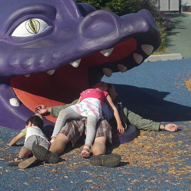 El tema de diseño es un castillo y un dragón, que están conectados con la colina de 'montaña' sobre la que se construyen los toboganes. Lo más destacado del castillo es un tobogán gigante desde la parte superior hasta la base de la 'montaña'. Hay una cabeza de dragón emergiendo de la superficie del patio de recreo, y los niños pueden jugar con la boca llena de dientes o subir sobre su cabeza. Más atrás en la "montaña", hay un huevo de dragón que se ha abierto y los niños pequeños también pueden jugar. Los lados de la montaña cerca de los toboganes descuidados tienen textura en garras de dragón.