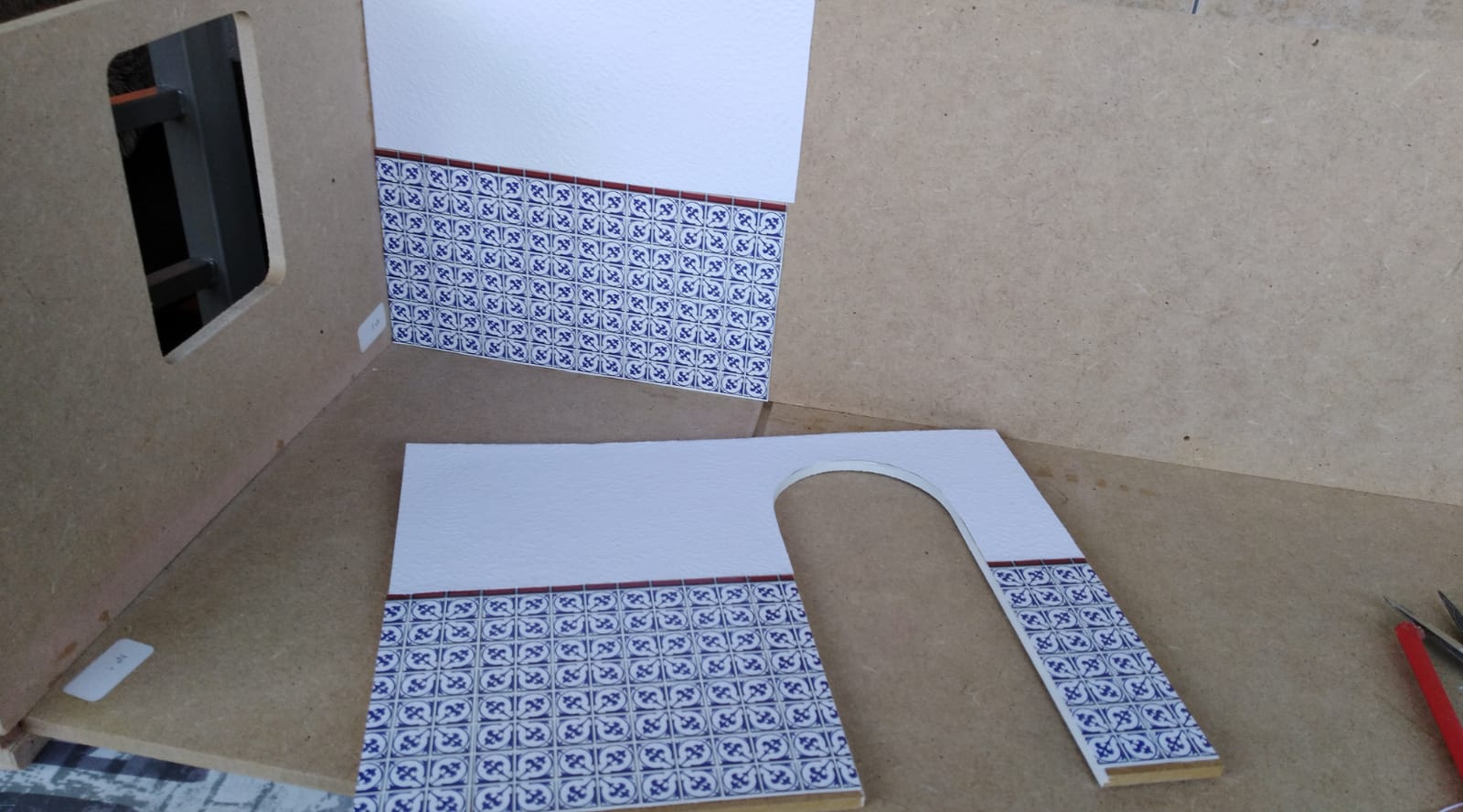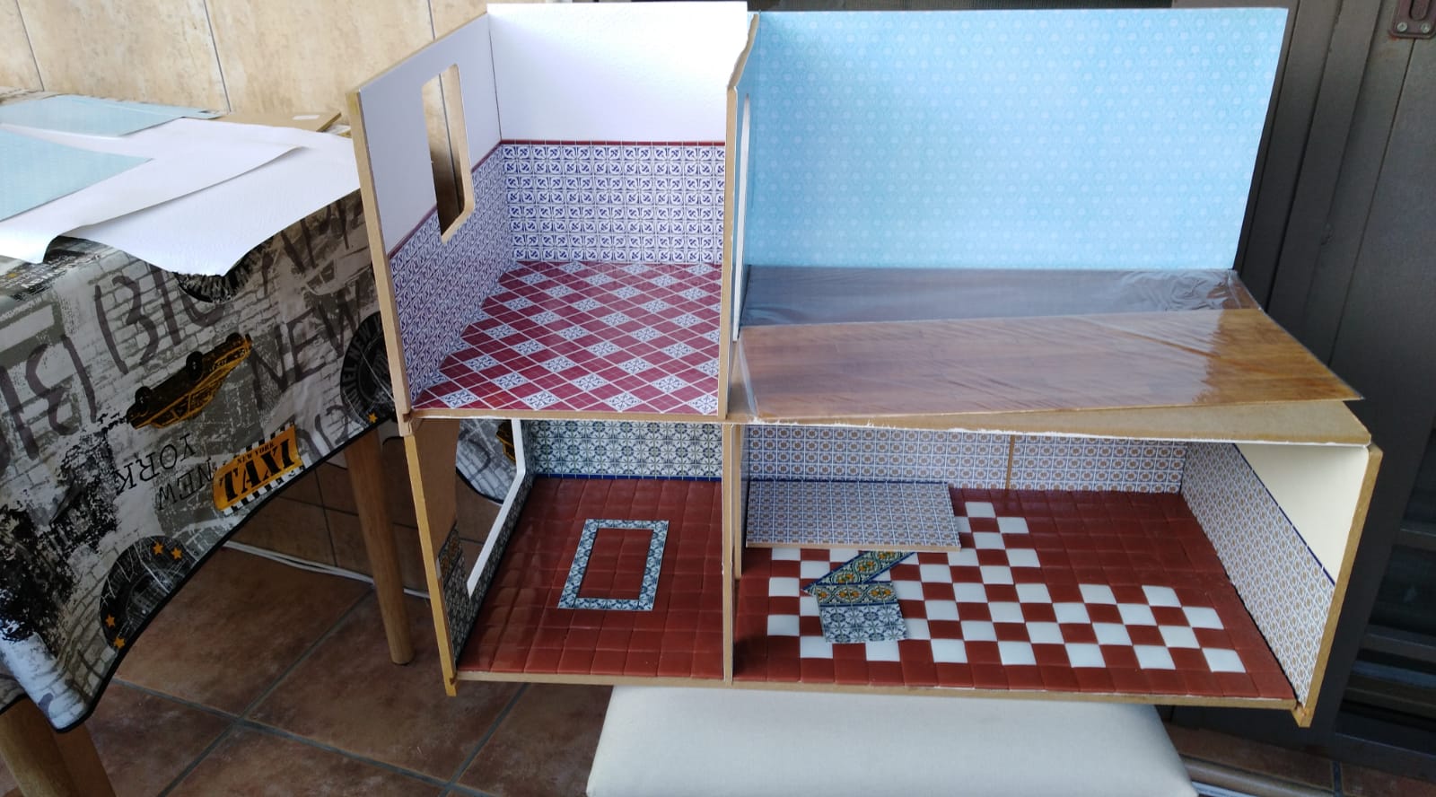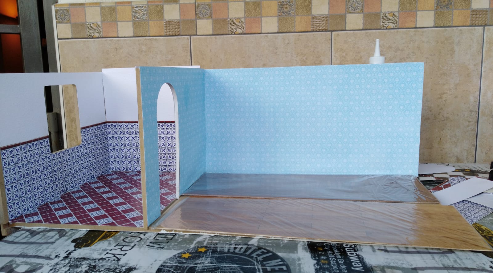 Es el mismo proceso, solo que los suelos son también de papel y lo pegamos con cola igual que el de las paredes.