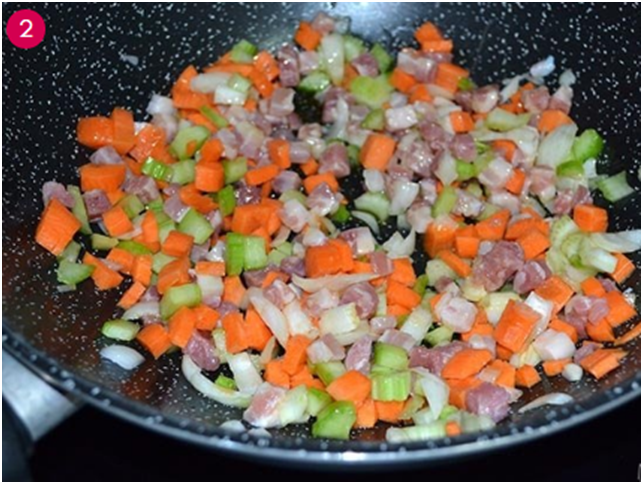 Zahrejte trochu oleja na veľkej panvici a opečte zeleninu a nakrájanú slaninu.