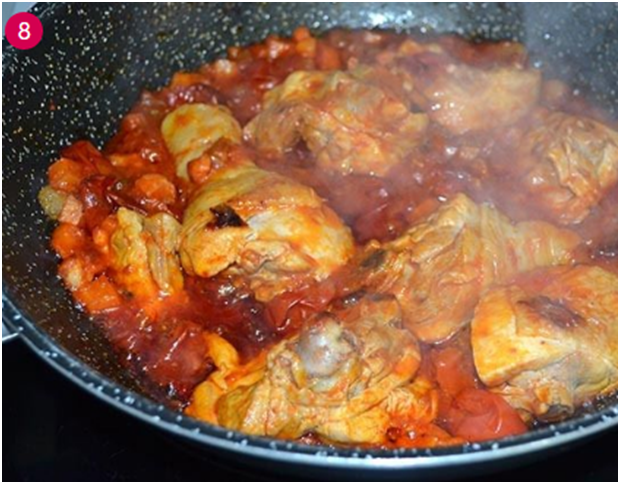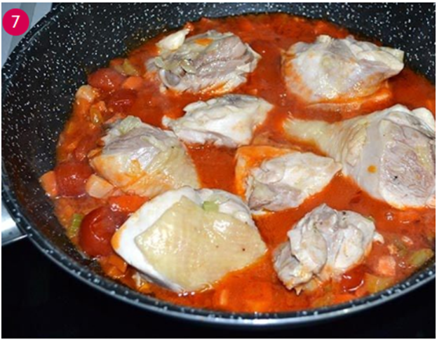 Potom stehná vložte späť do takto získanej omáčky, zakryte vekom a varte kuracie cestoviny na miernom ohni, znova asi desať minút, občas otočte.