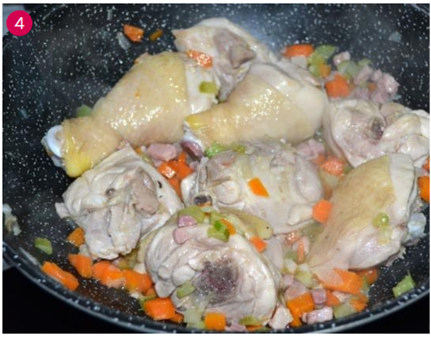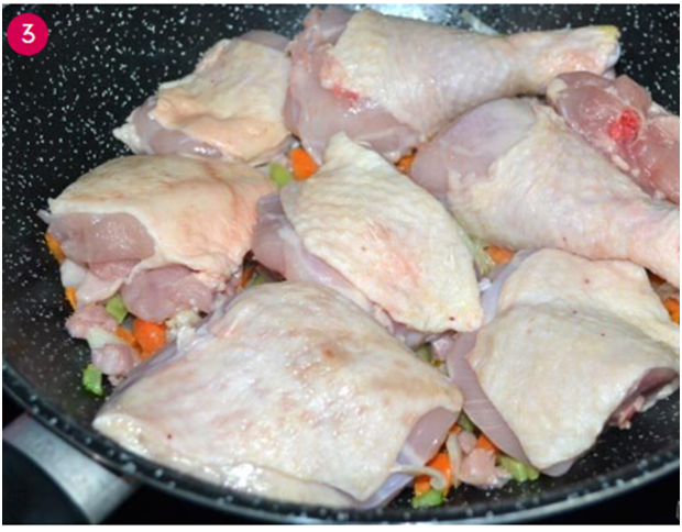 Kuracie stehná (so všetkou kožou) opečieme na zelenine a často ich otáčajte, až kým nie sú opečené na oboch stranách (približne 30 minút).