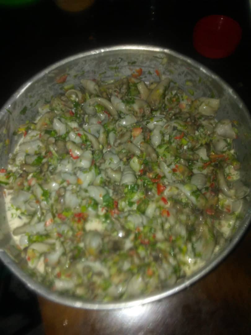 Que no queden tan blandos, se deja reposar mientras se pican todos los aliños si lleva ají picante mucho mejor. Se mezcla los aliños con los caracoles, se le pone más sal al gusto, bastante jugo de limón, vinagre y mayonesa al gusto. Lo probé y me encantó es buenísimo.