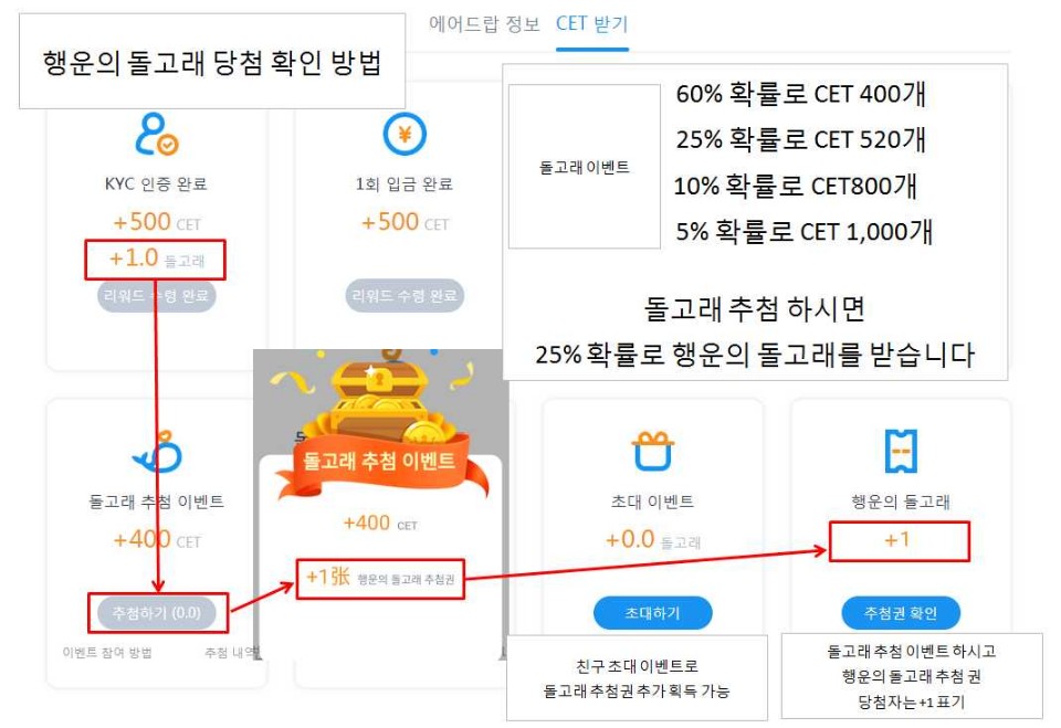 홈페이지 상단 오른쪽 부분에 체인스 리워드를 들어가셔서 CET 받기를 누르신 후 행운의 돌고래 추천을 클릭하시면 아래와 같이 CET를 얻으실 수 있습니다.
