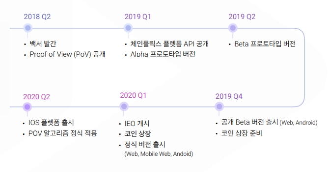 Chainflix는 2018년 6월 백서를 발간하고 Proof of View(PoV)를 공개함으로써 Chainflix의 비전을 제시했어요. 2019년 2월에는 Chainflix 플랫폼과 연결되어 동작할 응용프로그램을 위한 API 및 SDK를 개발하였구요. 2019년 1분기에는 Alpha 프로토타입 버전, 2019년 2분기에는 Beta 프로토타입 버전을 순차적으로 개발하였 고 그 후 테스트 단계를 거쳐 2019년 12월에 배타버전을 공개했답니다. 이후 Chainflix 플랫폼은 미디어 플레이어 기반한 전자지갑, 웹, APP 등을 함께 개발할 계획이다. 모든 플랫폼은 2020년 2분기 출시를 목표로 하고 열심히 개발과 전진을 하고 있는 체인플릭스 응원합니다.