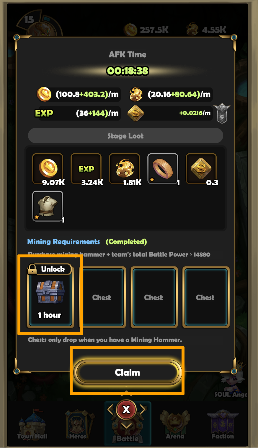 마이닝 보상은 망치 옆에 있는 보물 상자를 클릭해서 수령할 수 있습니다. 수령 버튼을 클릭하면 자리를 비운 사이에 채굴된 경험치와 아이템, 체인즈 아레나에서 사용되는 자체 코인 소울(SOUL)을 받을 수 있습니다.