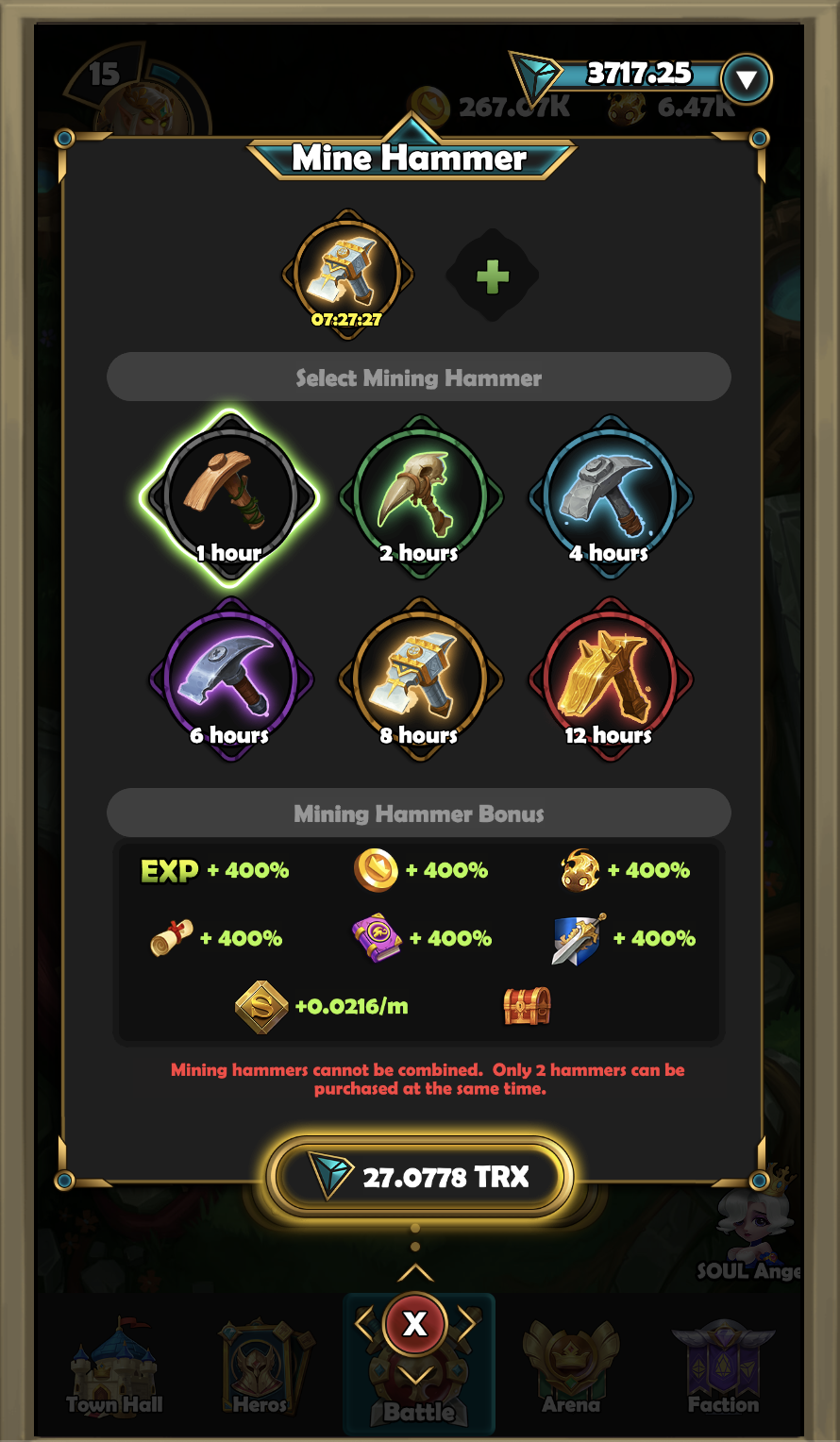 표에서 보시다시피 1시간짜리 망치를 여러번 사는 것이 가격 대비 효율이 가장 좋습니다. 1시간짜리 망치와 12시간짜리 망치 가격 효율 차이는 무려 2배가 넘습니다. 앞서 언급한 것처럼, 각 마이닝 망치의 보너스는 모두 동일하기 때문에 여유가 된다면 정기적으로 들어와 망치를 사주는 게 트론을 아낄 수 있는 방법입니다.
