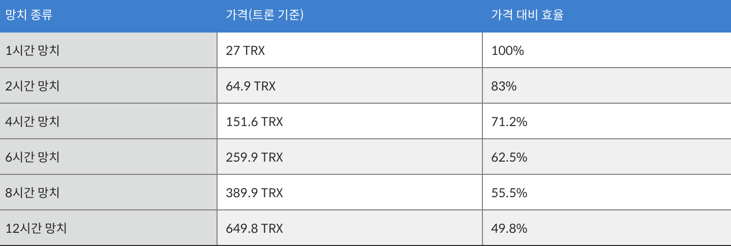 가격은 가장 싼 1시간짜리 망치 가격은 27트론이고, 12시간짜리 망치 가격은 649트론입니다. 언뜻 생각하면, 12시간짜리 망치가 좋은 거 같지만 가격 대비 효율은 1시간짜리 망치가 가장 좋습니다. 망치별 가격과 효율을 비교해 봤습니다.