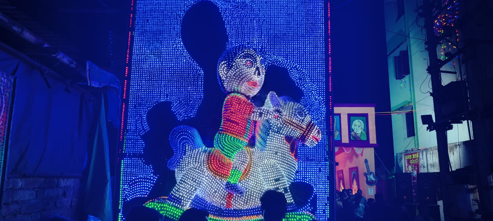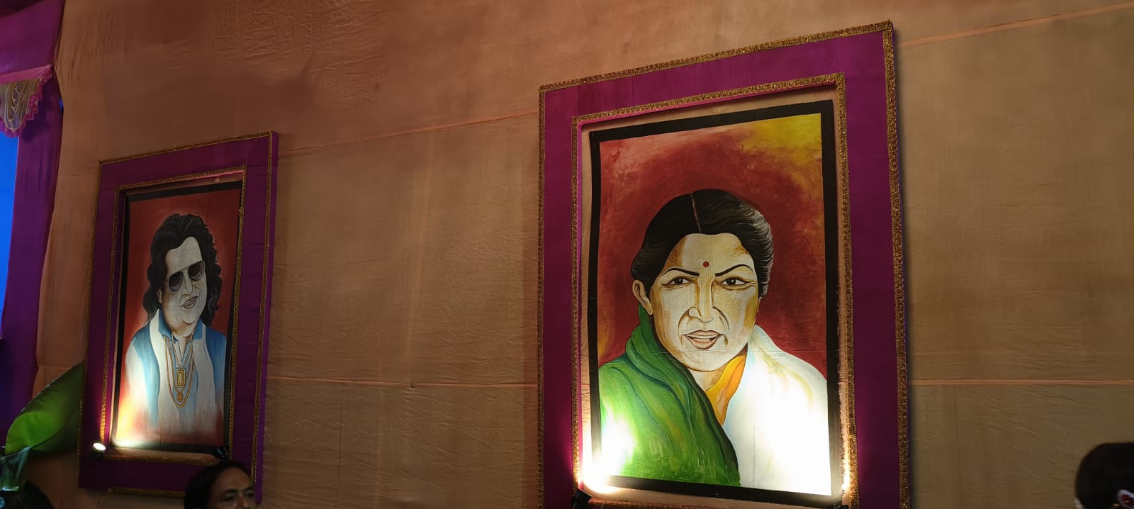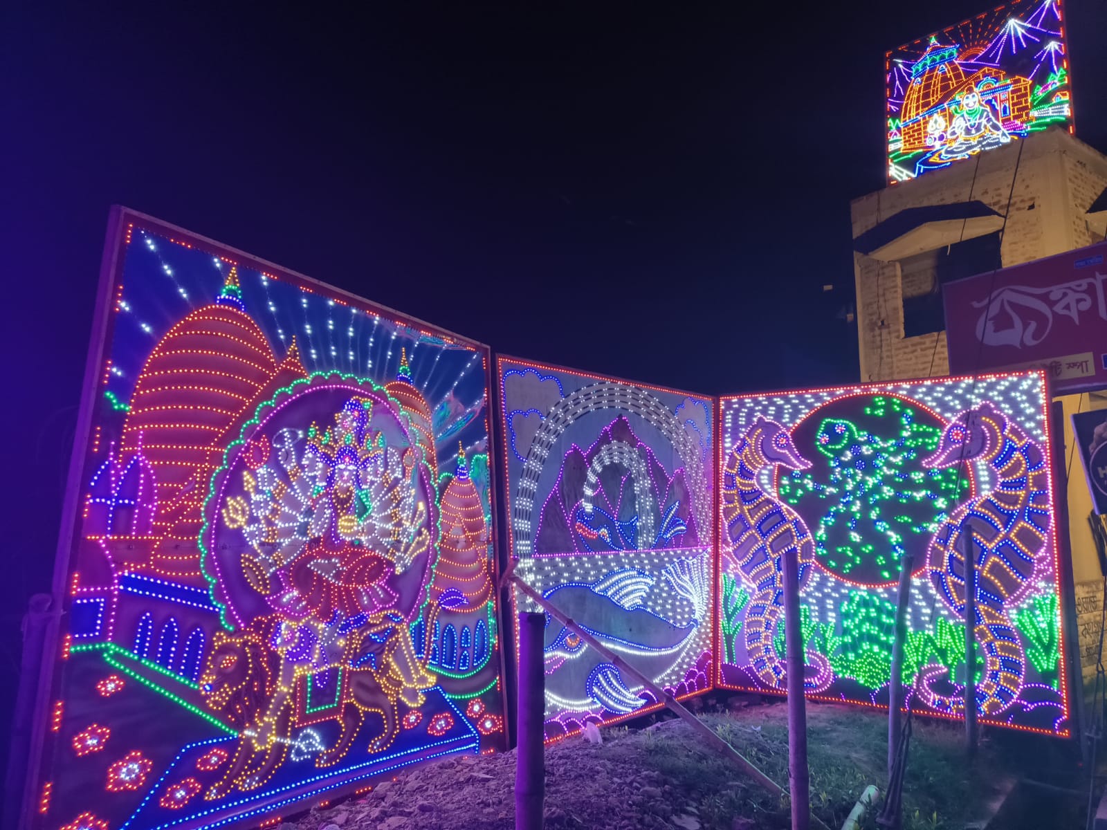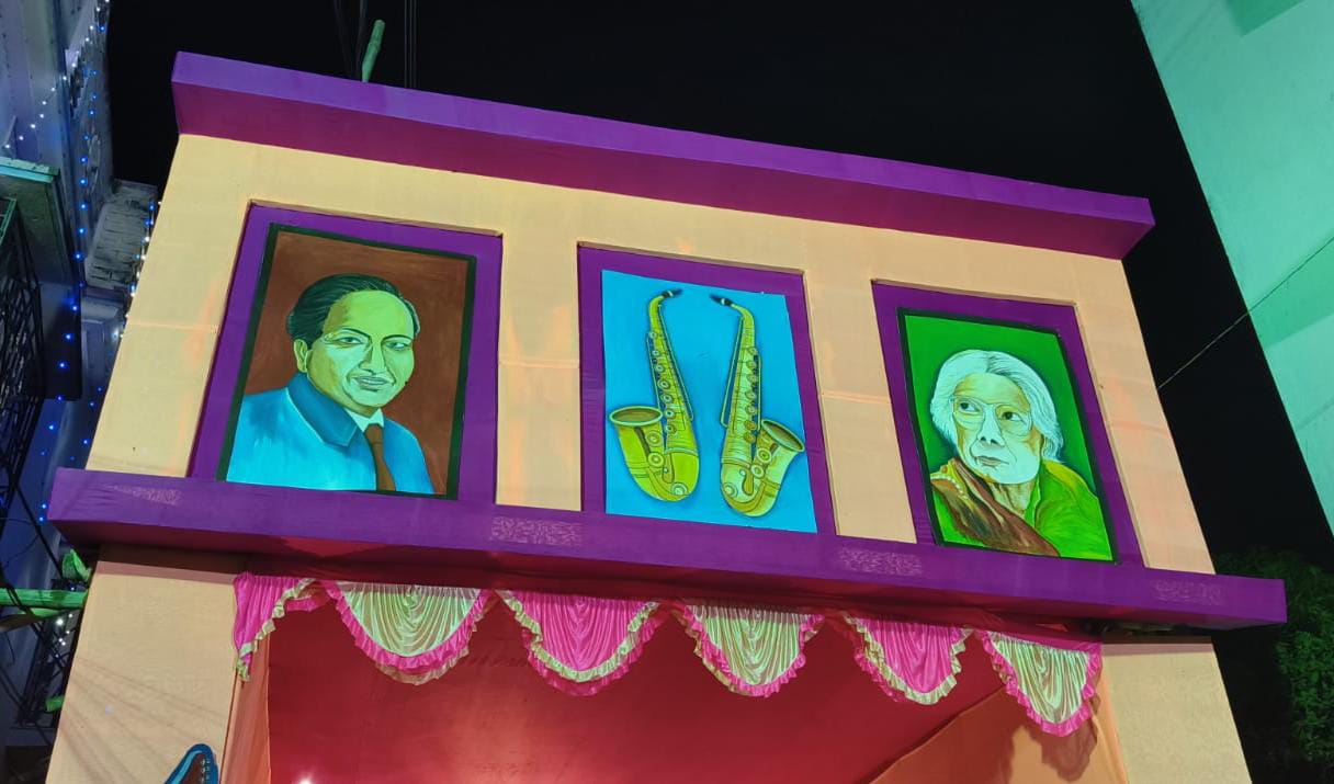 তারপর সেখান থেকে বেরিয়ে হালকা কিছু খেয়ে আবার ঠাকুর দেখতে শুরু করলাম কারন আমাদের খুব তাড়াতাড়ি ফিরতে হতো। এরপর ওই মণ্ডপের কাছাকাছি কয়েকটি ঠাকুর দেখলাম সেটি বিশেষত ছোটো একটা প্যান্ডেলের মধ্যে খুব সুন্দর একটি থিম করেছে যেটা হলো বিখ্যাত গায়ক শিল্পীদের নিয়ে পুরো প্যান্ডেলটি সাজানো হয়েছে ।তাছাড়া এখানকার এই মণ্ডপে ঢোকার আগে যে সকল লাইটিং গুলো দিয়ে সাজানো হয়েছে তা এক কথায় দারুন এবং দেখার মতো।