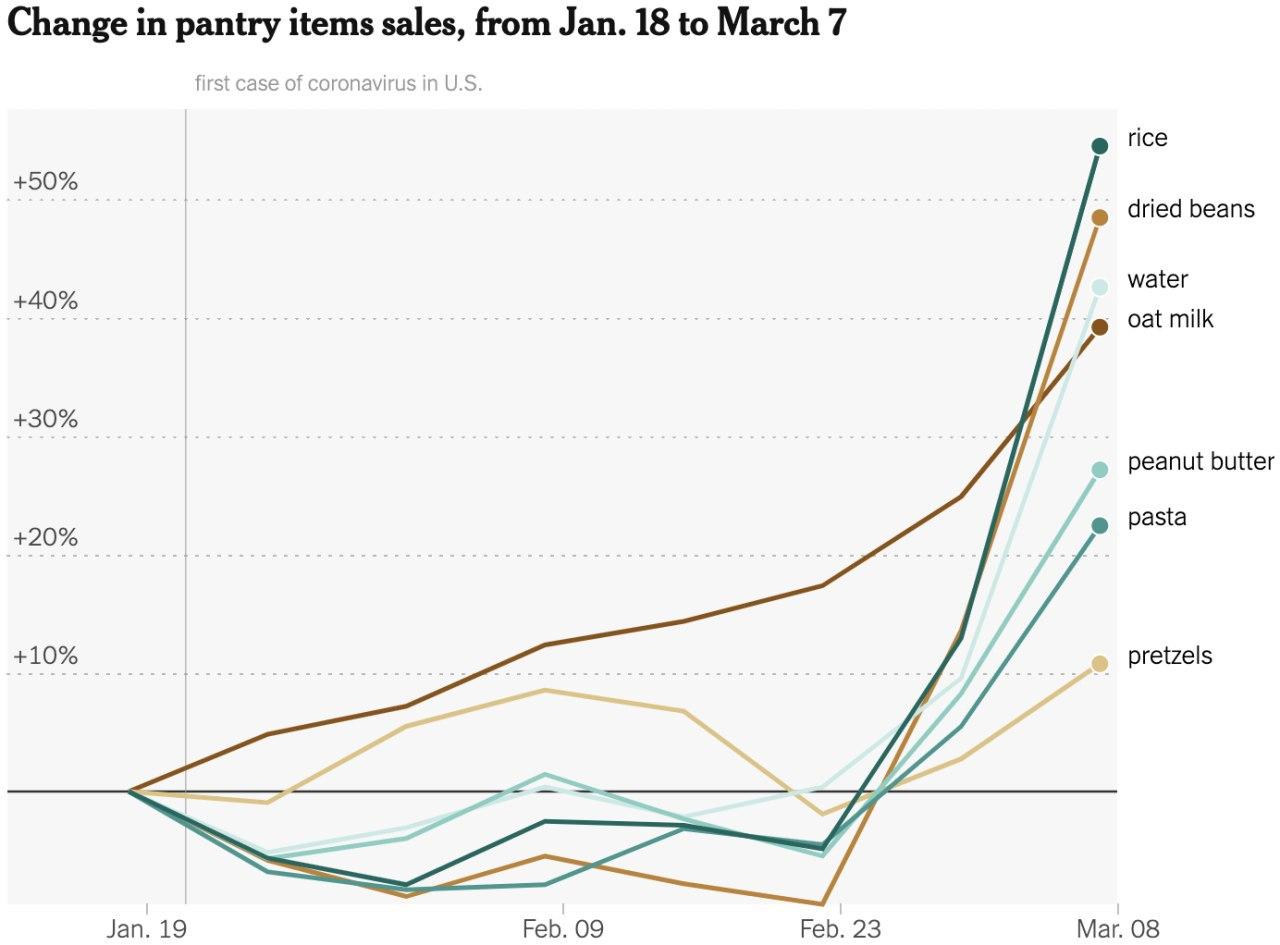 Change in salesann2406 (46)in #change • 6 years ago Change in sales of various food products in the United States from January 18 to March 7, 2020: rice, dried beans, water, oatmeal, peanut butter, pasta, pretzels. #food #products #rice #water #oatmeal #butter #pasta