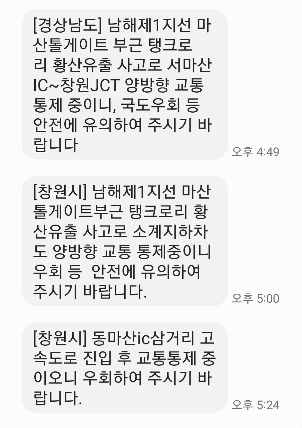 차에서 마산 톨게이트 근처에서 사고가 나서 유독물질이 유출된다는 문자를 확인했다