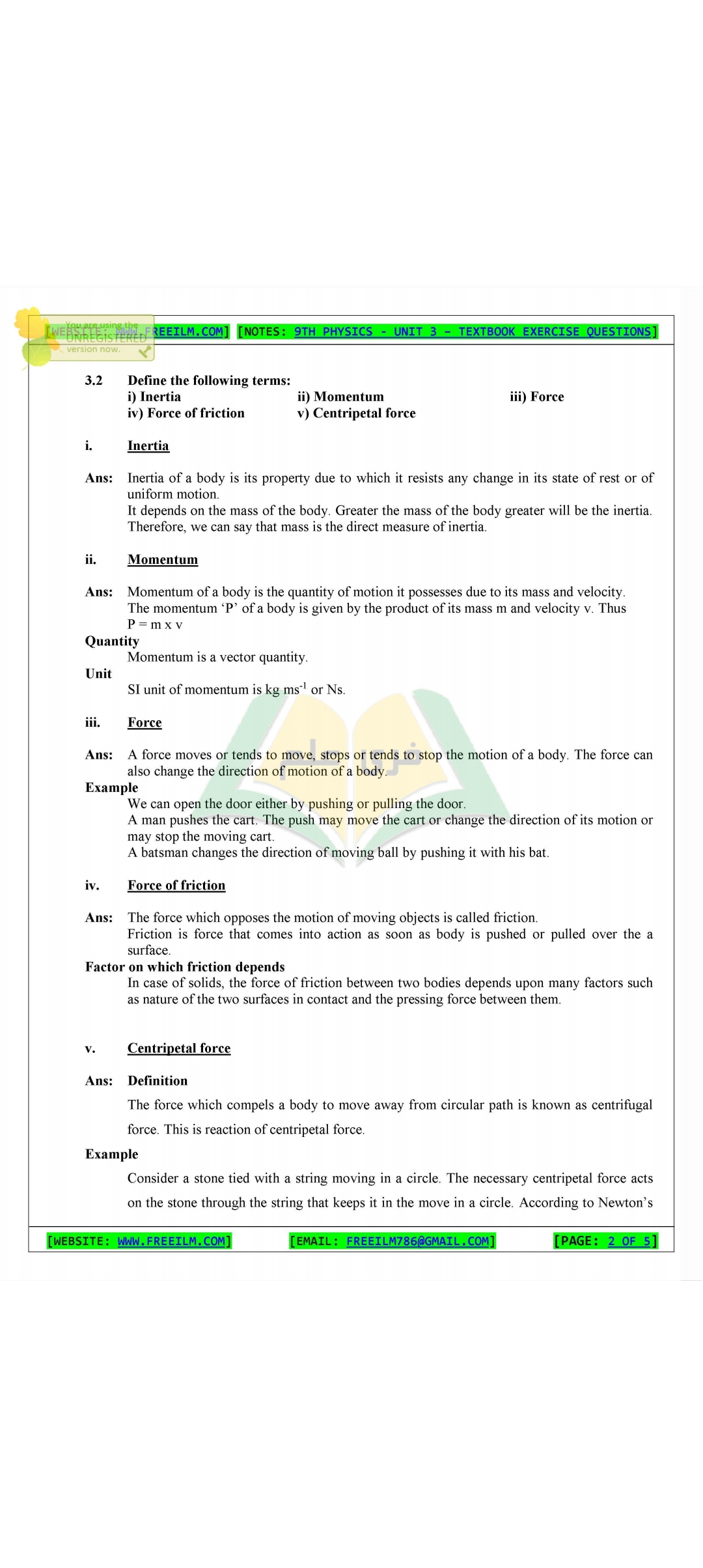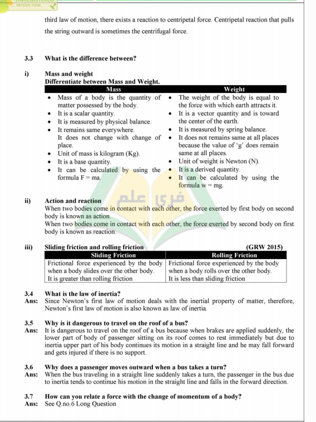 9th Physics Chapter 3 Notes Dynamics - MCQs, Questions and Numericals pdf