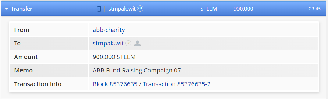 | 2024-05-24, 22:45 | winkles | abb-charity | 30.000 | STEEM | donation |