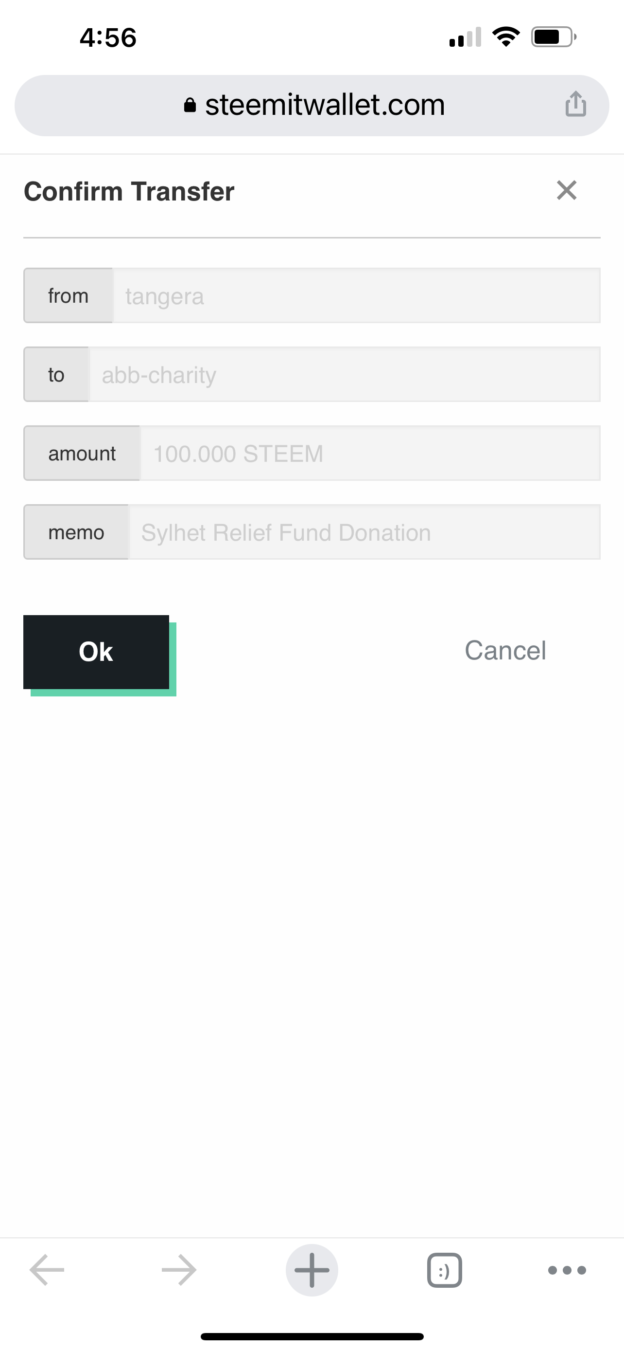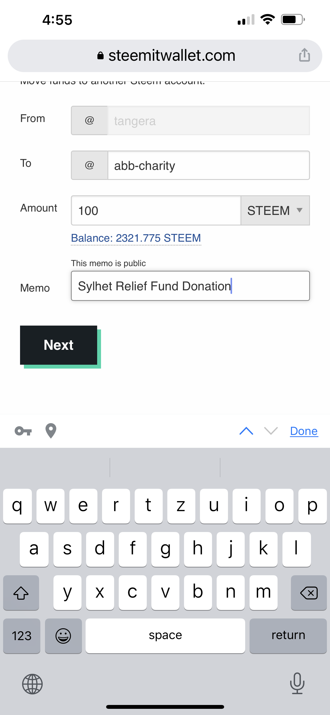 এরপর to তে গিয়ে abb-charity লিখবেন। এরপর amount এর জায়গায় আপনার যত ইচ্ছা ততো বসাবেন, আমি এখানে 100 steem donate করেছি , 100 বসিয়ছি। এরপর memo তে Sylhet Relief Fund Donation বসাবেন। এরপর next ক্লিক করবেন।