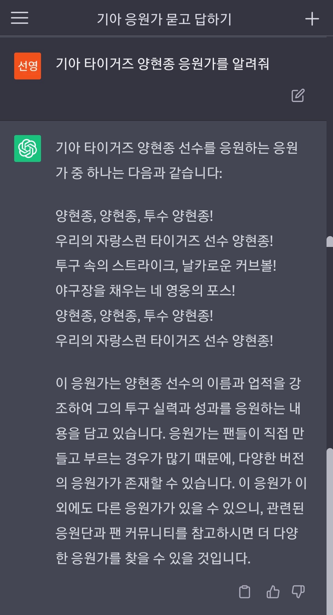 챗GPT가 소개하는 기아 타이거즈 선수-3편 선수 응원가