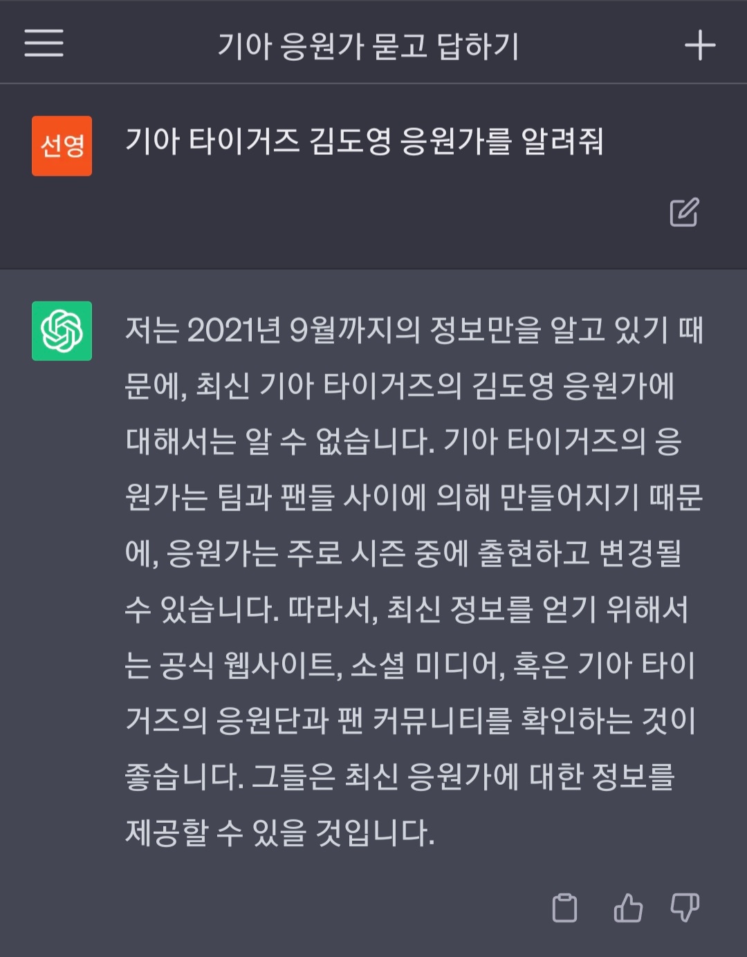 챗GPT에게 응원가는 물어보지 않기로 해요~~
