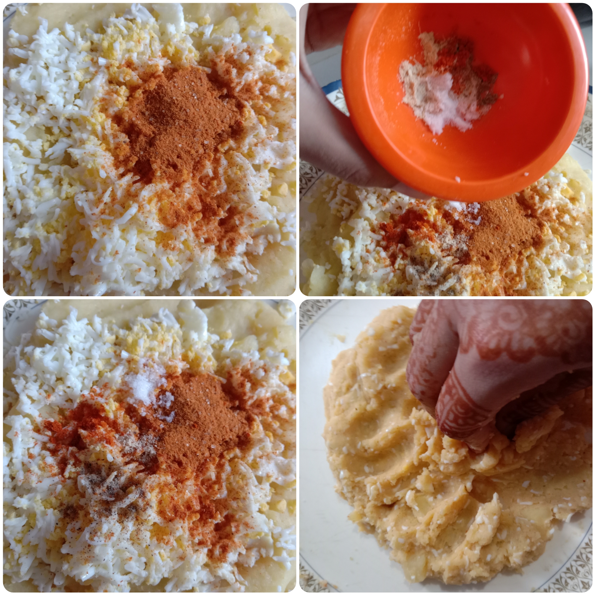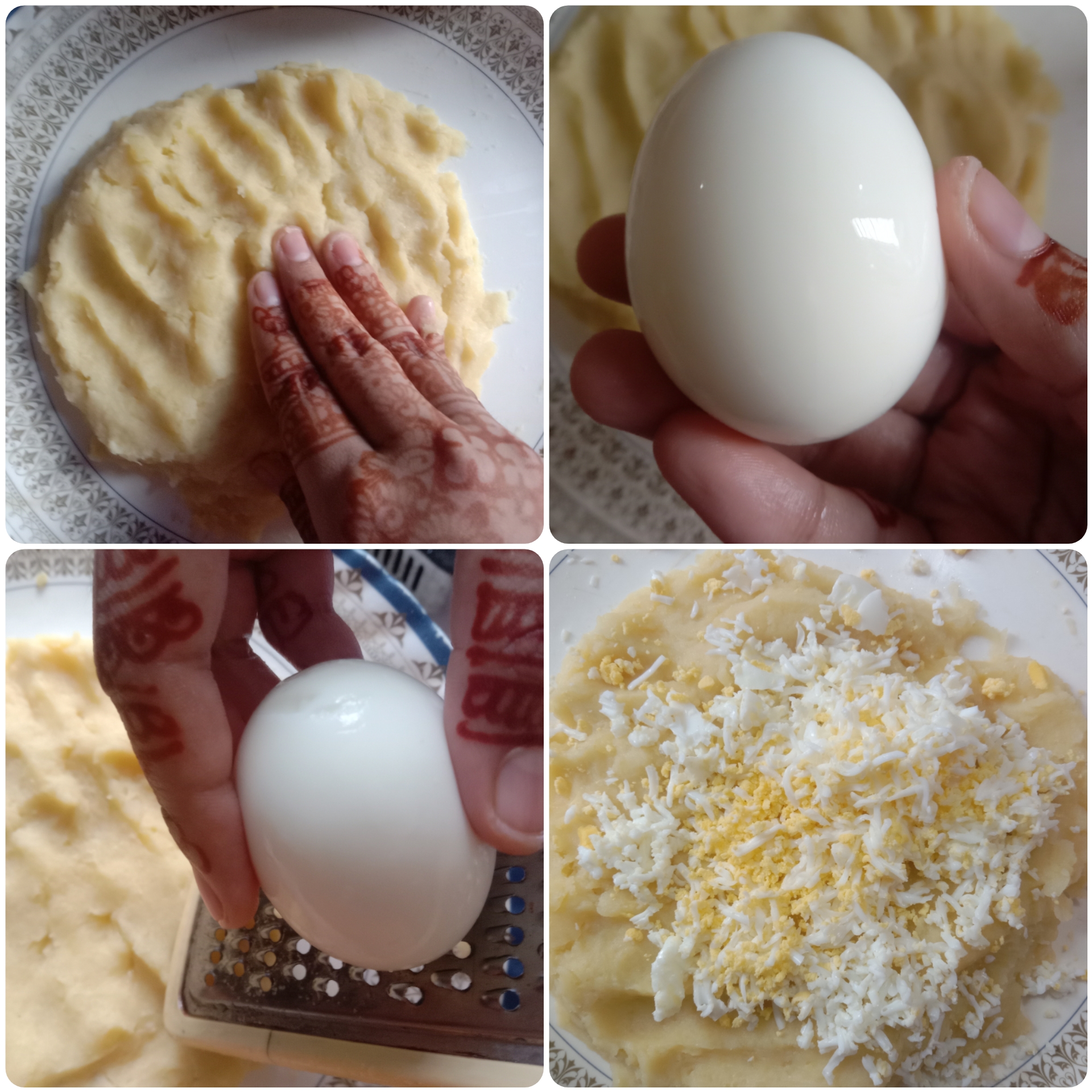 এবার ম্যাশ করা আলুর মধ্যে একটা সিদ্ধ ডিম নিয়ে একটা গ্রেটারের সাহায্যে পুরো ডিম টা গ্রেট করে নিয়েছি।