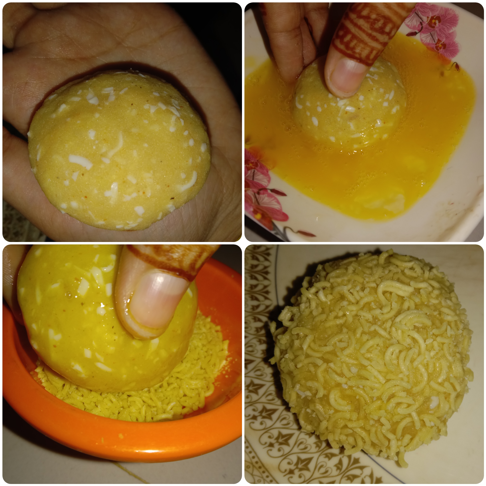 এবার একটা কাটলেট হাতে নিয়ে ডিমের মধ্যে চুবিয়ে নিয়ে তারপর নুডলস এর গুঁড়ার মধ্যে ভালো করে মিশিয়ে নিয়েছি।একইভাবে সবগুলো তৈরি করে নিয়েছি।