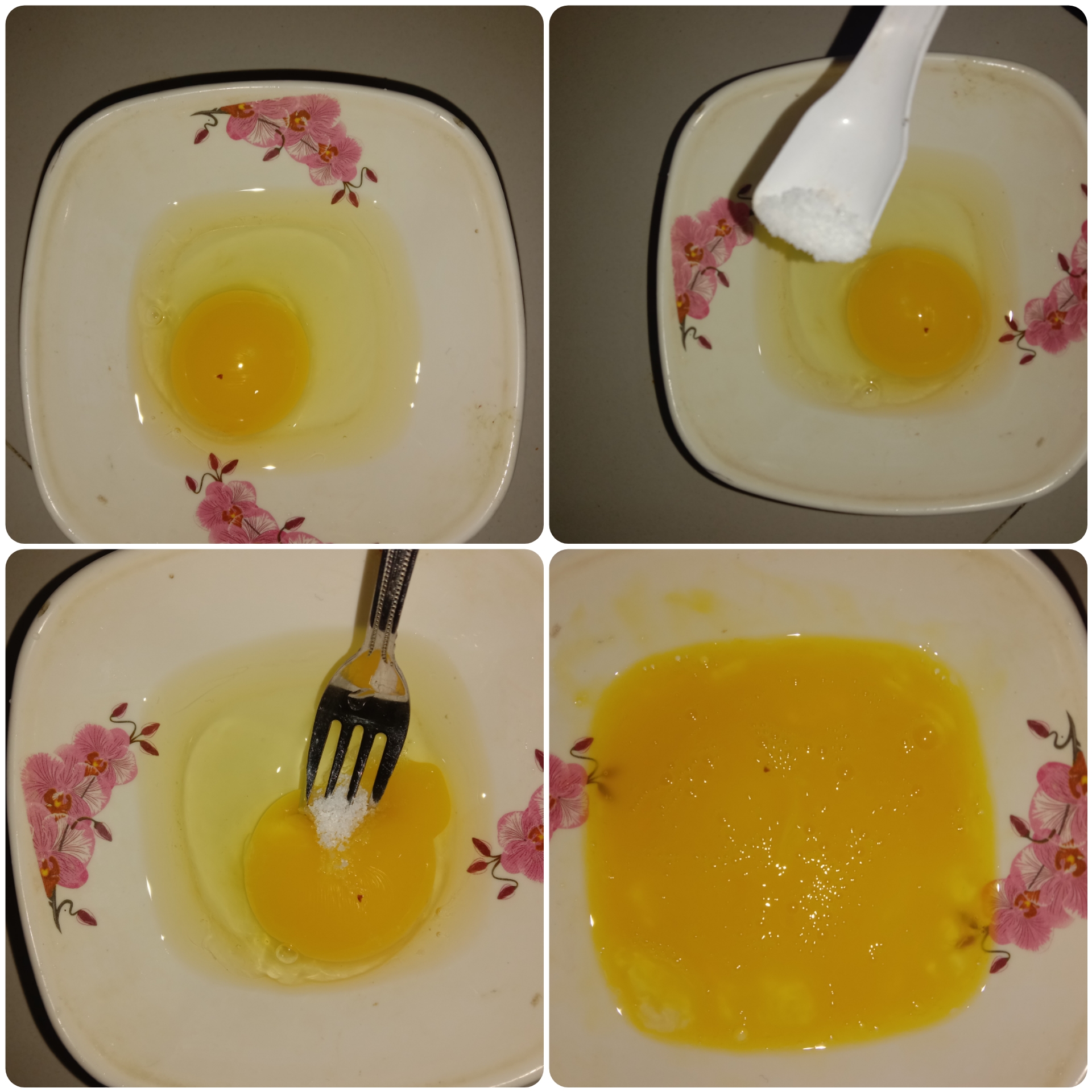 এবার একটা ডিম বাটিতে নিয়ে সামান্য পরিমাণে লবণ দিয়ে ভালো করে ফেটিয়ে নিয়েছি।