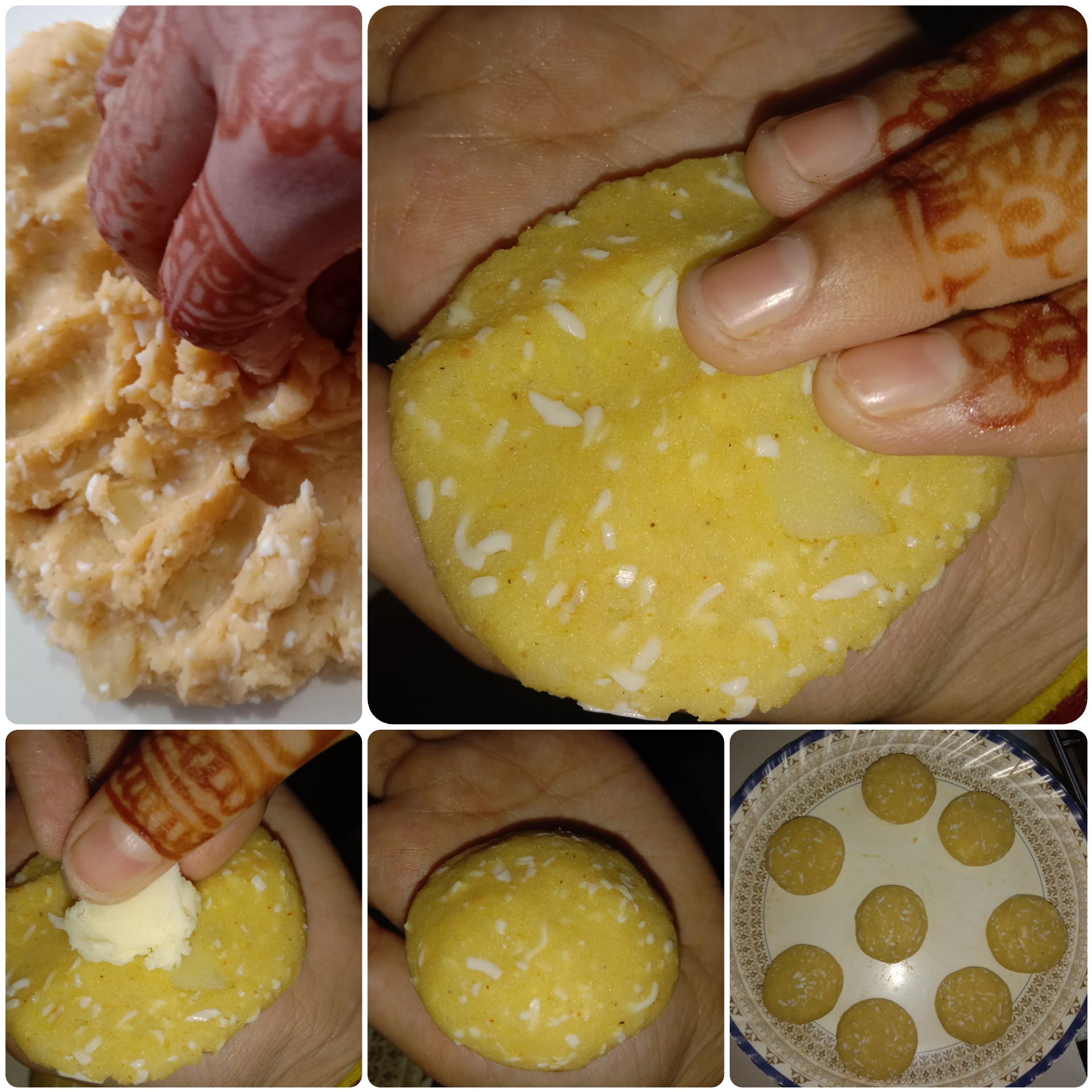 এবার আলু আর ডিমের মিশ্রণ অল্প পরিমাণে হাতে নিয়ে মাঝে এক টুকরো চিজ দিয়ে ভালো করে চেপে চেটে একটা গোলাকার বড়ার শেপ করে নিয়েছি।একে একে সবগুলো তৈরি করে নিয়েছি।